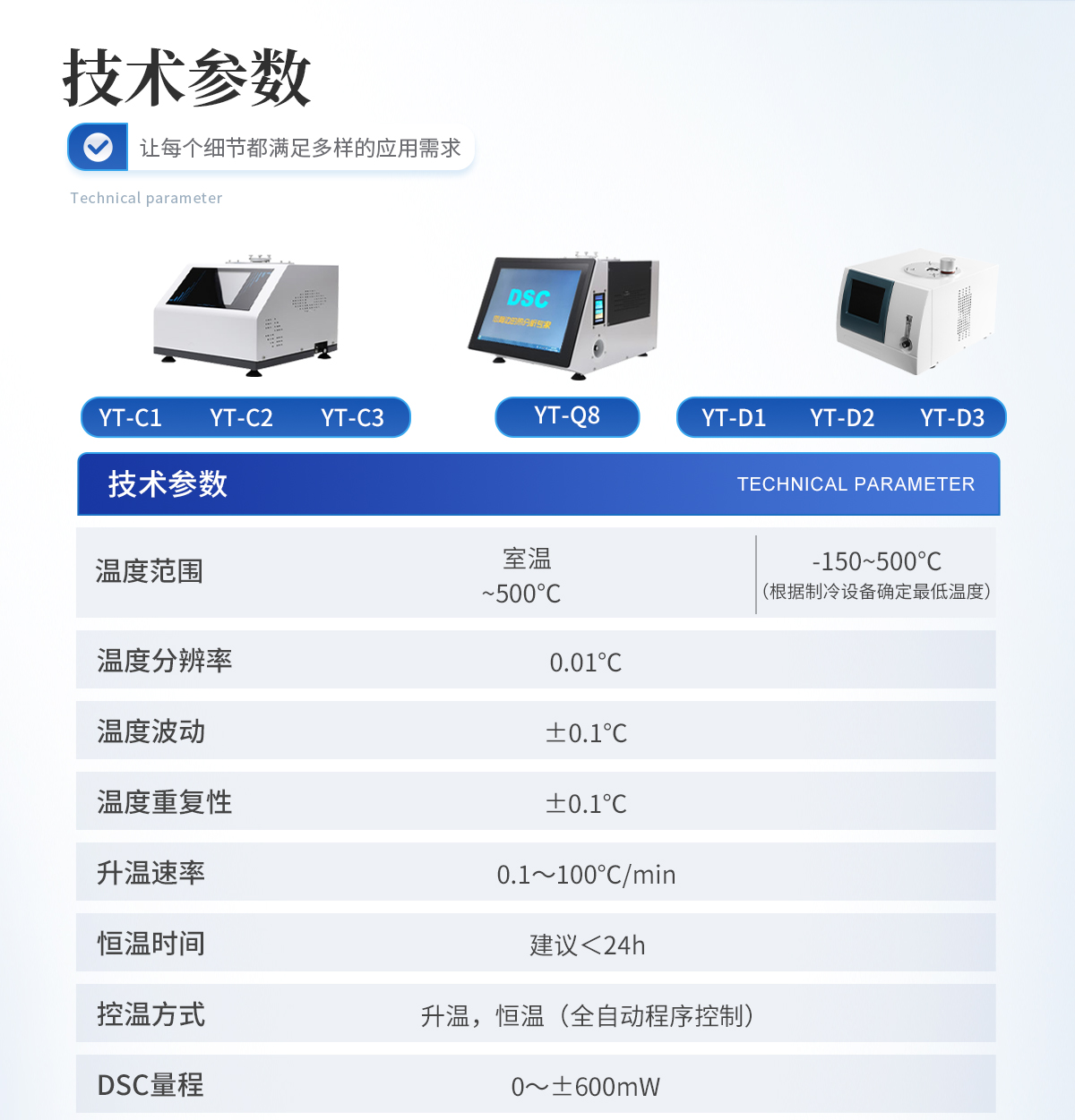 1.溫度范圍: -150~500℃ (根據(jù)制冷設(shè)備確定**溫度) 2.溫度分辨率: 0.01℃ 3.溫度波動: ±0.1℃ 4.溫度重復(fù)性: ±0.1℃ 5.升溫速率: 0.1~100℃/min 6.恒溫時間:建議<24h 7.控溫方式:升溫,恒溫(全自動程序控制) 8.DSC量程: 0~±600mW 9.DSC解析度: 0.01mW 10.DSC靈敏度: 0.01mW 11.工作電源: AC220V/50Hz或定制 12.可選冷卻設(shè)備: - 壓縮空氣冷卻(-AR):RT ... 500℃ - 機械制冷(-MR): -40 ... 500℃ - 液氮制冷(-LN):-150 ... 500℃ (可以單獨或同時連接多種冷卻裝置) 13. 氣氛控制氣體:氮氣、氧氣(儀器自動切換) 14.氣體流量:0-300mL/min 15.氣體壓力:0.2MPa 16.顯示方式: 24bit色,8寸 LCD觸摸屏顯示 17.數(shù)據(jù)接口:標(biāo)準(zhǔn)USB接口 18.參數(shù)標(biāo)準(zhǔn): 配有標(biāo)準(zhǔn)物質(zhì)(銦,錫,鋅),用戶可自行校正溫度