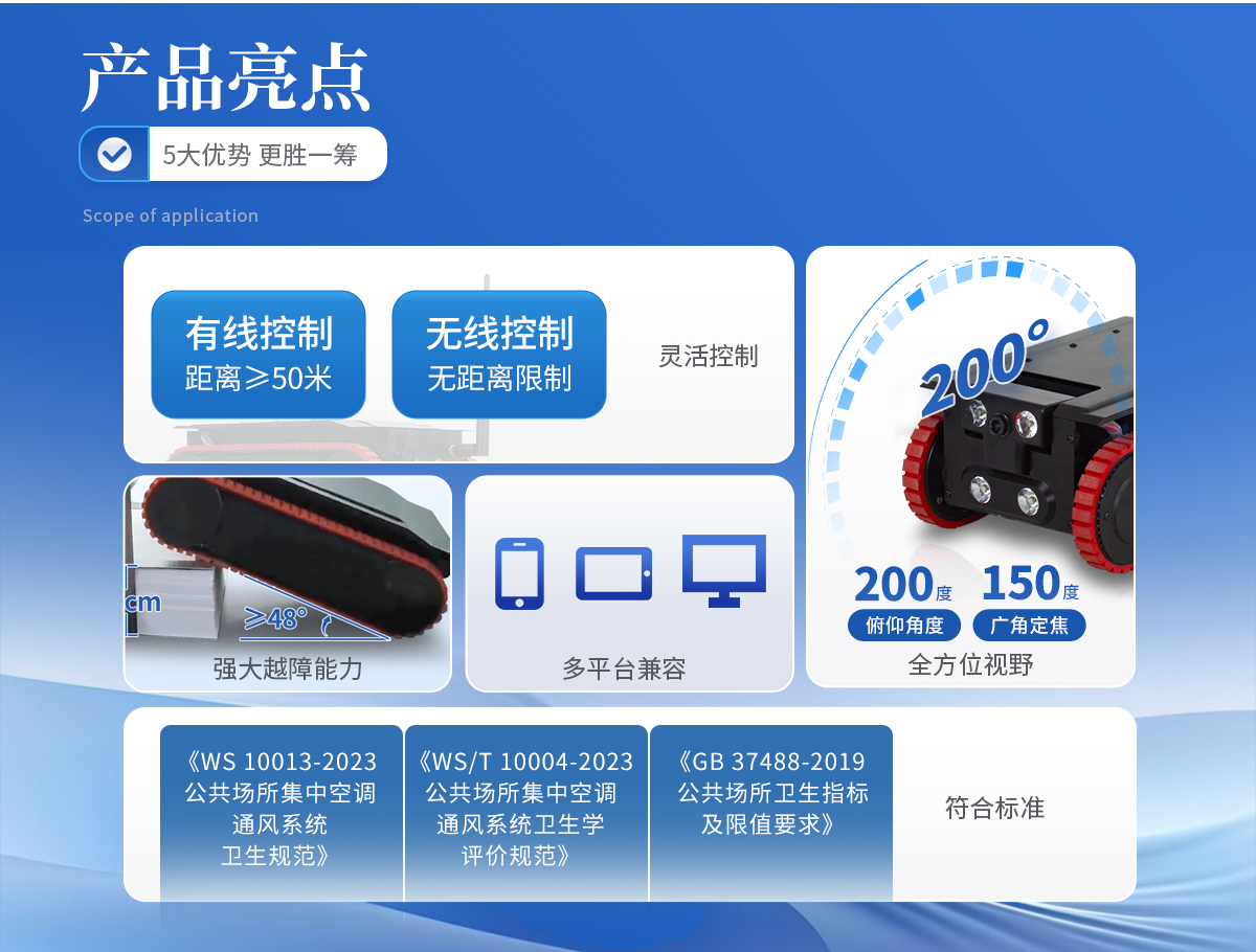 定量采樣機(jī)器人是一款專(zhuān)為公共場(chǎng)所集中空調(diào)通風(fēng)系統(tǒng)內(nèi)部采樣設(shè)計(jì)的高精度、便攜式智能設(shè)備。該產(chǎn)品嚴(yán)格按照《WS 10013-2023公共場(chǎng)所集中空調(diào)通風(fēng)系統(tǒng)衛(wèi)生規(guī)范》、《WS/T 10004-2023公共場(chǎng)所集中空調(diào)通風(fēng)系統(tǒng)衛(wèi)生學(xué)評(píng)價(jià)規(guī)范》以及《GB 37488-2019公共場(chǎng)所衛(wèi)生指標(biāo)及限值要求》中的相關(guān)標(biāo)準(zhǔn)進(jìn)行設(shè)計(jì)與制造,確保了其在各種工業(yè)環(huán)境下的穩(wěn)定性和可靠性。它采用了**的航空鋁合金材料,結(jié)合了**的移動(dòng)性能與卓越的采樣技術(shù),能夠滿(mǎn)足多種行業(yè)的通風(fēng)管道檢測(cè)和維護(hù)工作需求。