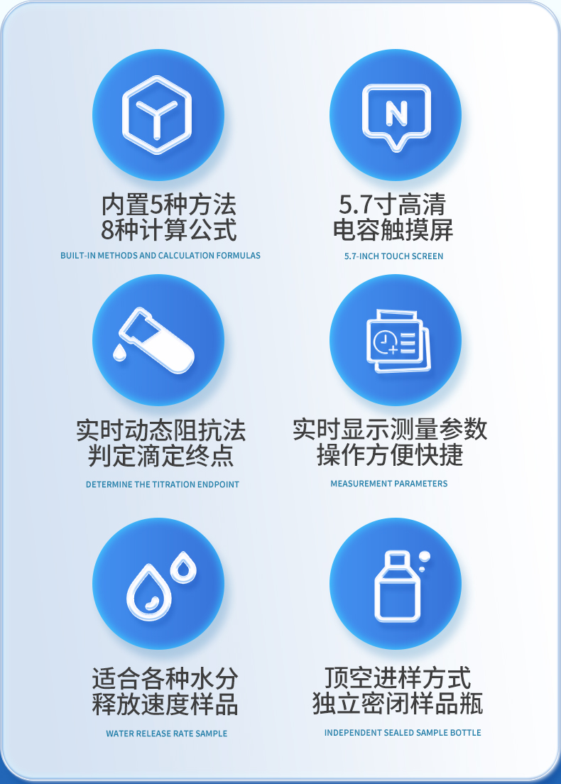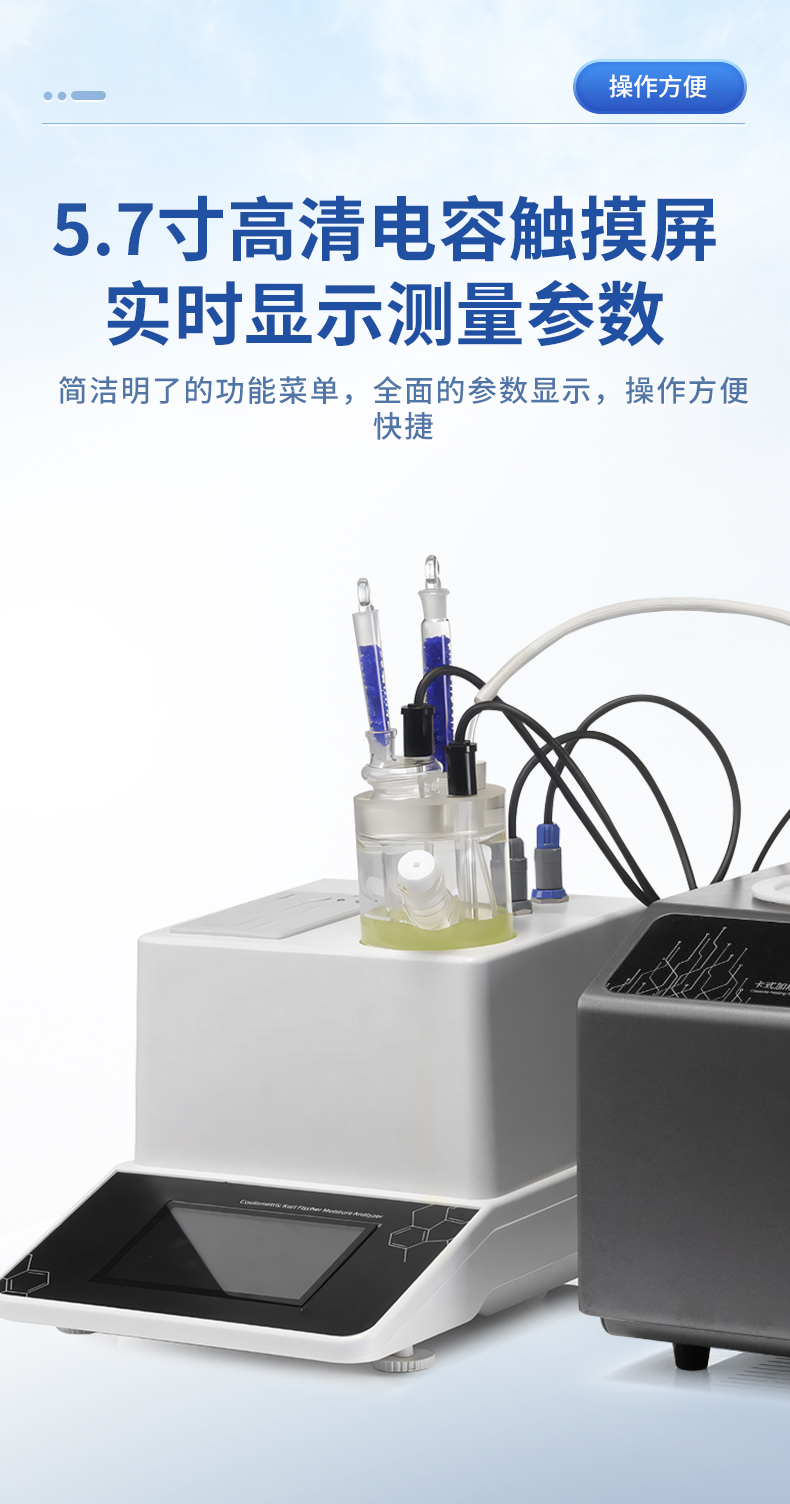 | 1. 采用高精度庫(kù)侖法水分測(cè)定儀與卡氏加熱爐聯(lián)用,**可以檢測(cè)到3μg水,精度達(dá)到ppm級(jí); | 2. 空芯氣針進(jìn)樣,和帶加熱功能的氣體輸送管路,零死體積水汽不凝結(jié),操作更簡(jiǎn)單,同時(shí)也很大的提高了儀器的準(zhǔn)確性和重復(fù)性; | 3. 5.7寸高清電容觸摸屏,實(shí)時(shí)顯示測(cè)量參數(shù),簡(jiǎn)潔明了的功能菜單,全面的參數(shù)顯示,操作方便快捷 ; | 4. 內(nèi)置5種方法可供選擇,8種計(jì)算公式方便各種樣品檢測(cè),自定義樣品單位%、ppm、mg/kg等結(jié)果單位更加人性化; | 5. 系統(tǒng)實(shí)時(shí)檢測(cè)環(huán)境中的水分,精準(zhǔn)扣除漂移,采用實(shí)時(shí)動(dòng)態(tài)阻抗法判定滴定終點(diǎn),測(cè)量結(jié)果更精準(zhǔn); | 6. **溫度300℃可以滿足大部分樣品檢測(cè),氣流0-100ml可調(diào),適合各種水分釋放速度的樣品; | 7. 操作方便,用戶只需要設(shè)置合適的溫度,合適的流量,把樣品放入事先準(zhǔn)備好的樣品瓶,放入加熱器,然后把傳輸針扎入樣品瓶的硅膠墊,在儀器上點(diǎn)開始測(cè)量即可; | 8. 無需等待上一次樣品瓶冷卻之后才能進(jìn)行下一次樣品測(cè)量,更換樣品瓶過程中樣品瓶始終保持密封狀態(tài),測(cè)量效率更高更準(zhǔn)確,尤其是吸濕性強(qiáng)的樣品無需擔(dān)心空氣中水分的干擾; | 9. 采用頂空進(jìn)樣的方式,保證每個(gè)測(cè)定采用“新”的樣品瓶,樣品測(cè)定無交叉感染。樣品瓶體積小,確保較小的死體積和背景水分值。獨(dú)立密閉樣品瓶,測(cè)定時(shí)無需樣品轉(zhuǎn)移,結(jié)果更準(zhǔn)確; | 10. 旋蓋式樣品瓶,無需專用且昂貴的壓蓋器和開蓋器,使用非常方便; | 11. 頂空進(jìn)樣技術(shù),只有氣體進(jìn)入水分測(cè)定儀反應(yīng)杯,不污染反應(yīng)杯及電解電極。 |