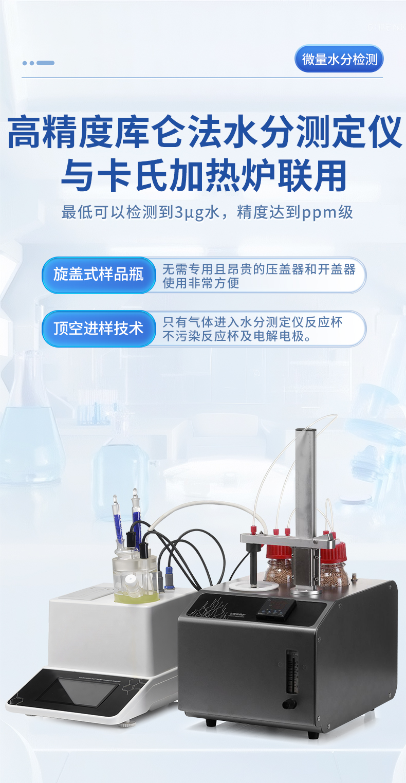 | 1、微量水分檢測(cè),儀器檢測(cè)精度可以達(dá)到ppm級(jí),非常適合鋰電、塑料、石化等行業(yè)對(duì)水分檢測(cè)要求高的行業(yè)。 | 2、樣品量有限的產(chǎn)品水分檢測(cè),**20mg即可測(cè)試(取樣重量根據(jù)樣品含水量決定),適用于醫(yī)藥行業(yè)等樣品貴重且有限的行業(yè)。 | 3、產(chǎn)品加熱有除水以外的揮發(fā)物的水分檢測(cè),常規(guī)加熱失重法難以測(cè)試,適用于化學(xué)工業(yè)等領(lǐng)域。 |