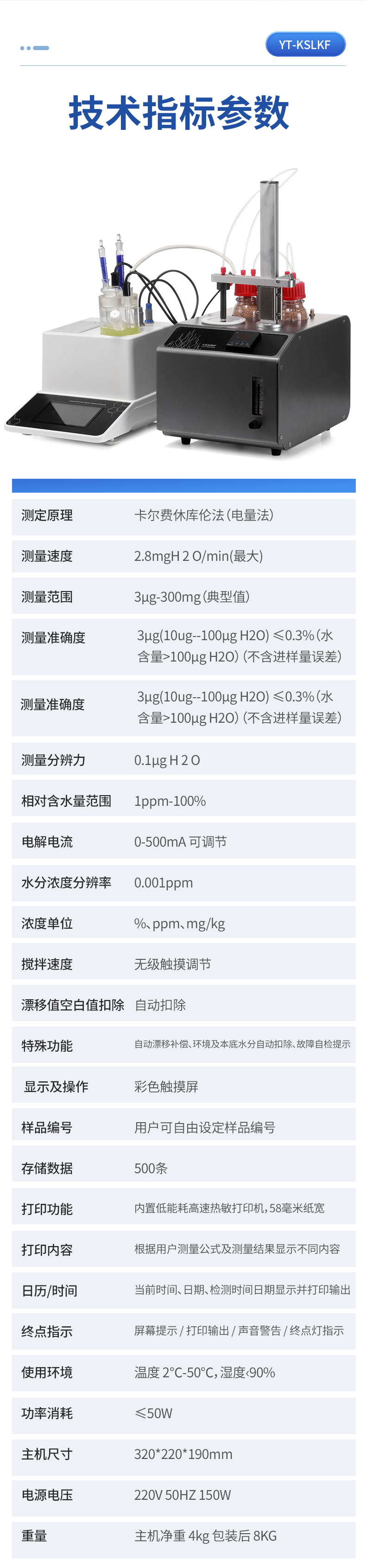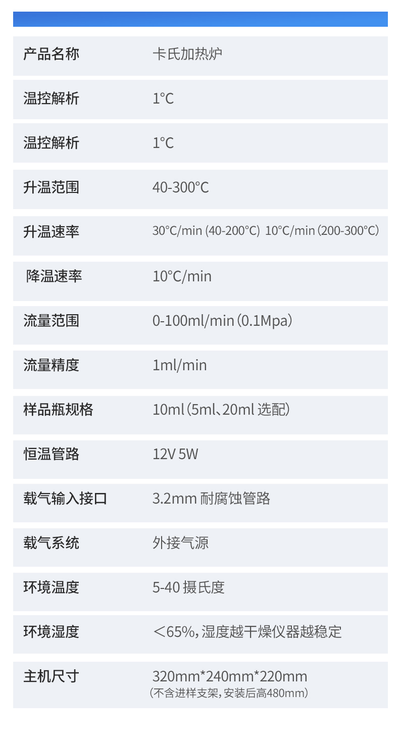 | 1. 測(cè)定原理:卡爾費(fèi)休庫(kù)倫法(電量法) | 2. 測(cè)量速度:2.8mgH 2 O/min(**) | 3. 測(cè)量范圍:3μg-300mg(典型值) | 4. 測(cè)量準(zhǔn)確度:3μg(10ug--100μg H2O) ≤0.3%(水含量>100μg H2O)(不含進(jìn)樣量誤差) | 5. 測(cè)量準(zhǔn)確度:3μg(10ug--100μg H2O) ≤0.3%(水含量>100μg H2O)(不含進(jìn)樣量誤差) | 6. 測(cè)量分辨力:0.1μg H 2 O | 7. 相對(duì)含水量范圍:1ppm-100% | 8. 電解電流:0-500mA 可調(diào)節(jié) | 9. 水分濃度分辨率:0.001ppm | 10. 濃度單位:%、ppm、mg/kg | 11. 攪拌速度:無級(jí)觸摸調(diào)節(jié) | 12. 漂移值空白值扣除:自動(dòng)扣除 | 13. 特殊功能:自動(dòng)漂移補(bǔ)償、環(huán)境及本底水分自動(dòng)扣除、故障自檢提示 | 14. 顯示及操作:彩色觸摸屏 | 15. 樣品編號(hào):用戶可自由設(shè)定樣品編號(hào) | 16. 存儲(chǔ)數(shù)據(jù):500條 | 17. 打印功能:內(nèi)置低能耗高速熱敏打印機(jī),58毫米紙寬 | 18. 打印內(nèi)容:根據(jù)用戶測(cè)量公式及測(cè)量結(jié)果顯示不同內(nèi)容 | 19. 日歷/時(shí)間:當(dāng)前時(shí)間、日期、檢測(cè)時(shí)間日期顯示并打印輸出 | 20. 終點(diǎn)指示:屏幕提示 / 打印輸出 / 聲音警告 / 終點(diǎn)燈指示 | 21. 使用環(huán)境:溫度 2℃-50℃,濕度?90% | 22. 功率消耗:≤50W | 23. 主機(jī)尺寸:320*220*190mm | 24. 電源電壓:220V 50HZ 150W | 25. 重量:主機(jī)凈重 4kg 包裝后 8KG | 26. 產(chǎn)品名稱:卡氏加熱爐 | 27. 溫控解析:1℃ | 28. 溫控解析:1℃ | 29. 升溫范圍:40-300℃ | 30. 升溫速率:30℃/min (40-200℃) 10℃/min(200-300℃) | 31. 降溫速率:10℃/min | 32. 流量范圍:0-100ml/min(0.1Mpa) | 33. 流量精度:1ml/min | 34. 樣品瓶規(guī)格:10ml(5ml、20ml 選配) | 35. 恒溫管路:12V 5W | 36. 載氣輸入接口:3.2mm 耐腐蝕管路 | 37. 載氣系統(tǒng):外接氣源 | 38. 環(huán)境溫度:5-40 攝氏度 | 39. 環(huán)境濕度:<65%,濕度越干燥儀器越穩(wěn)定 | 40. 主機(jī)尺寸:320mm*240mm*220mm(不含進(jìn)樣支架,安裝后高480mm) |