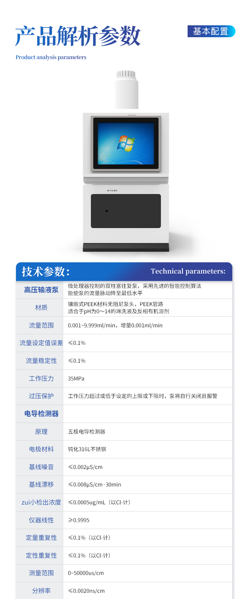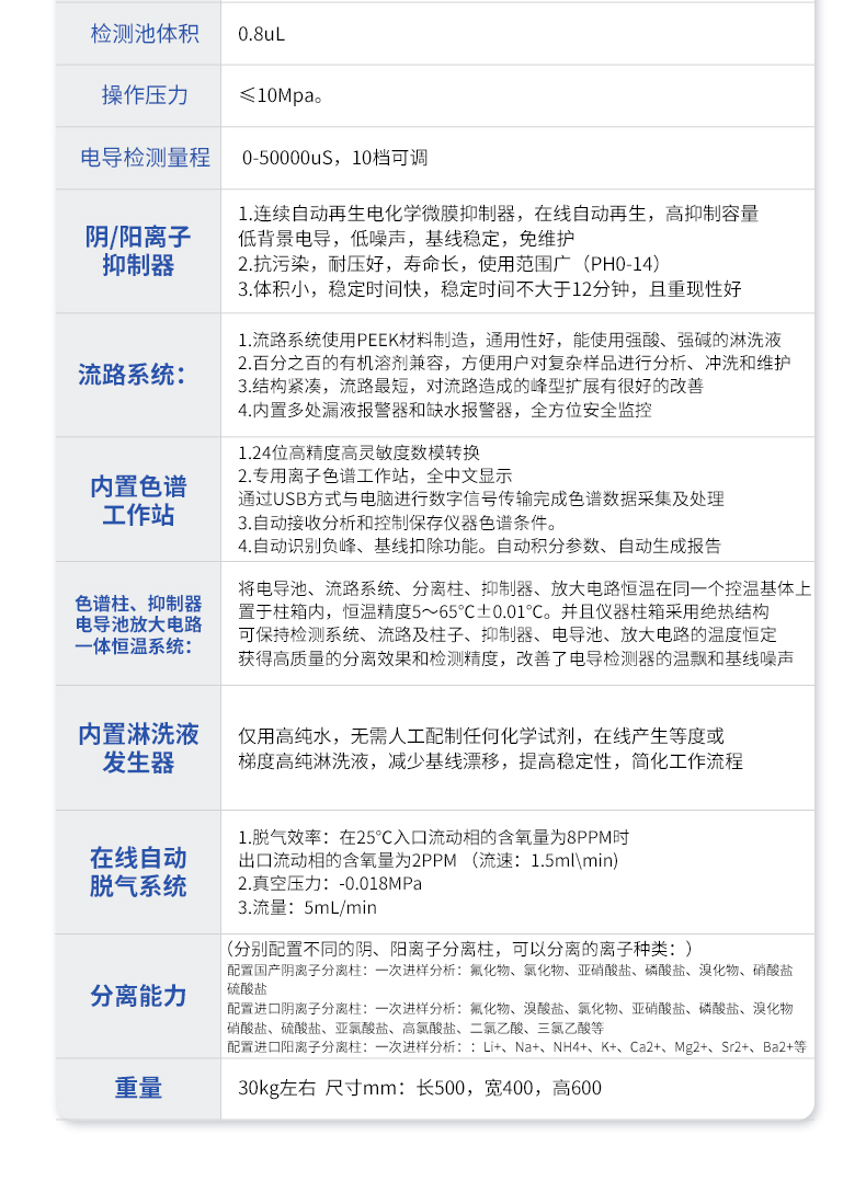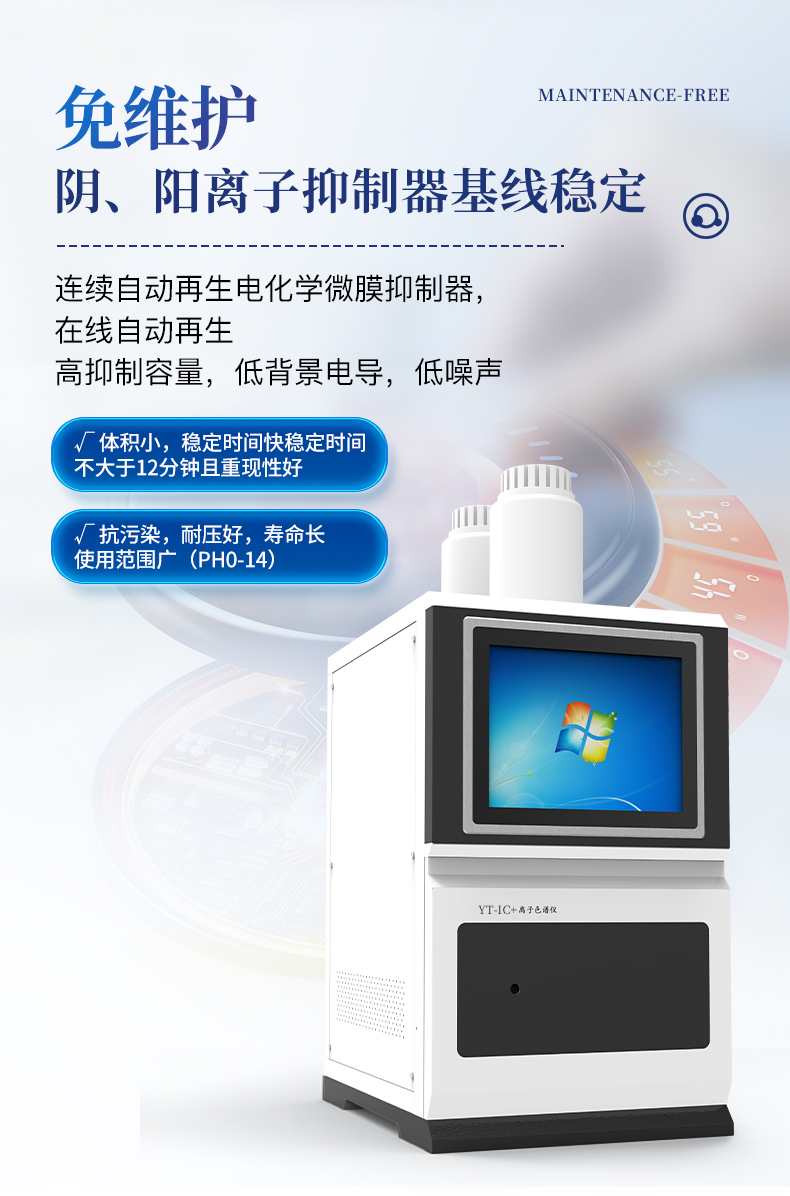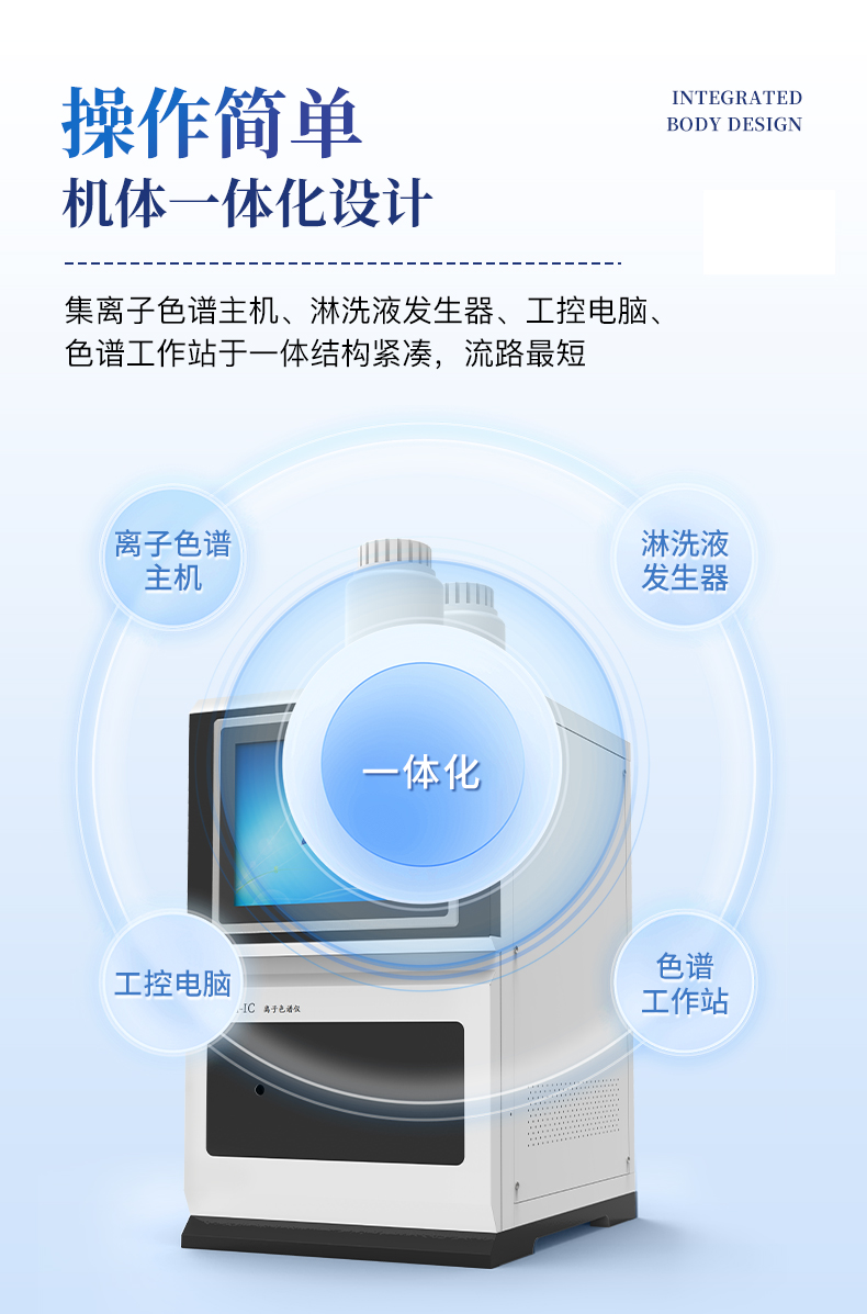 | 我們公司作為離子色譜儀器市場的新業(yè)態(tài),一直致力于為用戶提供更快捷、優(yōu)質(zhì)的儀器,以保障實(shí)驗(yàn)室的建設(shè)和運(yùn)行。始終堅(jiān)持以客戶為中心,為有檢測需求的客戶服務(wù)。物美價(jià)廉、響應(yīng)迅捷、服務(wù)全面。 | 全新一代離子色譜儀,采用12.1吋純平工控電腦一體機(jī)設(shè)計(jì)(用戶不需要配電腦),實(shí)時(shí)顯示儀器運(yùn)行參數(shù)和狀態(tài);一鍵啟動(dòng)電動(dòng)閥進(jìn)樣,一鍵完成儀器開關(guān)機(jī)、維護(hù)等操作,一鍵調(diào)閱儀器操作教程,方便快捷。 | 離子色譜儀核心零部件自主研發(fā)、自主知識(shí)產(chǎn)權(quán)可控。采用一體化設(shè)計(jì),集離子色譜主機(jī)、淋洗液發(fā)生器、工控電腦、色譜工作站于一體,結(jié)構(gòu)緊湊,流路*短,對(duì)流路造成的峰型擴(kuò)展有很好的改善。一體化恒溫箱:色譜柱、抑制器、電導(dǎo)池、放大電路都處于同一恒溫系統(tǒng),改善了電導(dǎo)檢測器的溫飄和基線噪聲。內(nèi)置多處漏液報(bào)警器和缺水報(bào)警器,全方位安全監(jiān)控。由PLC控制的各個(gè)部件統(tǒng)一到電腦顯示屏的集中軟件控制系統(tǒng),操作方便,鼠標(biāo)所見即所控。 |