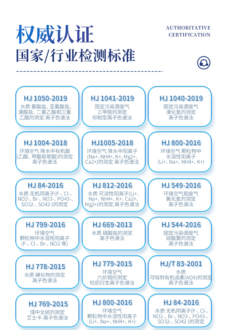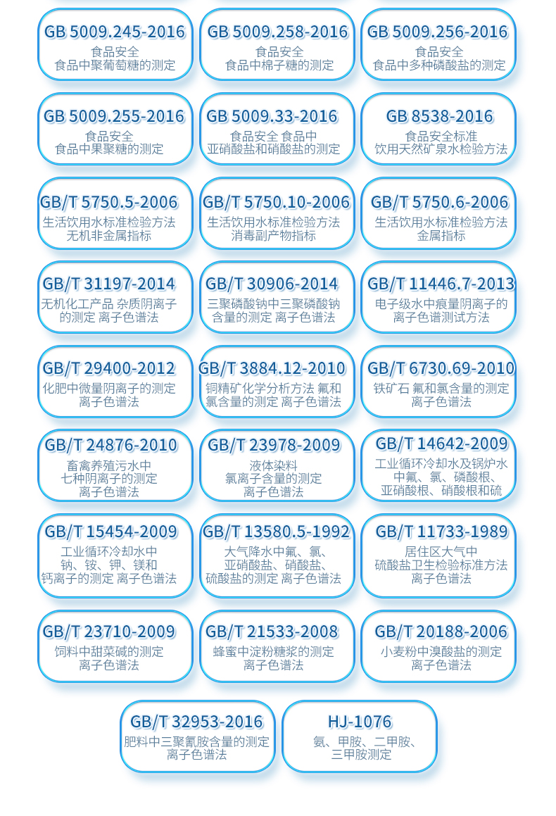 | HJ 1050-2019 水質(zhì) 氯酸鹽、亞氯酸鹽、溴酸鹽、二氯乙酸和三氯乙酸的測定 離子色譜法 | HJ 1041-2019 固定污染源廢氣 三甲胺的測定 抑制型離子色譜法 | HJ 1040-2019 固定污染源廢氣 溴化氫的測定 離子色譜法 | HJ 1004-2018 環(huán)境空氣 降水中有機(jī)酸(乙酸、甲酸和草酸)的測定 離子色譜法 | HJ1005-2018 環(huán)境空氣 降水中陽離子(Na+、NH4+、K+、Mg2+、Ca2+)的測定 離子色譜法 | HJ 800-2016 環(huán)境空氣 顆粒物中水溶性陽離子(Li+、Na+、NH4+、K+) | HJ 84-2016 水質(zhì) 無機(jī)陰離子(F-、Cl-、NO2-、Br-、NO3-、PO43-、SO32-、SO42-)的測定 | HJ 812-2016 水質(zhì) 可溶性陽離子(Li+、Na+、NH4+、K+、Ca2+、Mg2+)的測定 離子色譜法 | HJ 549-2016 環(huán)境空氣和廢氣 氯化氫的測定 離子色譜法 | HJ 799-2016 環(huán)境空氣 顆粒物中水溶性陰離子(F-、Cl-、Br-、NO2-等) | HJ 669-2013 水質(zhì) 磷酸鹽的測定 離子色譜法 | HJ 544-2016 固定污染源廢氣 硫酸霧的測定 離子色譜法 | HJ 778-2015 水質(zhì) 碘化物的測定 離子色譜法 | HJ 779-2015 環(huán)境空氣 六價(jià)鉻的測定 柱后衍生離子色譜法 | HJ/T 83-2001 水質(zhì) 可吸附有機(jī)鹵素(AOX)的測定 離子色譜法 | HJ 769-2015 煤中全硫的測定 艾士卡-離子色譜法 | HJ 800-2016 環(huán)境空氣 顆粒物中水溶性陽離子(Li+、Na+、NH4+、K+) | HJ 84-2016 水質(zhì) 無機(jī)陰離子(F-、Cl-、NO2-、Br-、NO3-、PO43-、SO32-、SO42-)的測定 | GB 5009.245-2016 食品安全 食品中聚葡萄糖的測定 | GB 5009.258-2016 食品安全 食品中棉子糖的測定 | GB 5009.256-2016 食品安全 食品中多種磷酸鹽的測定 | GB 5009.255-2016 食品安全 食品中果聚糖的測定 | GB 5009.33-2016 食品安全 食品中亞硝酸鹽和硝酸鹽的測定 | GB 8538-2016 食品安全標(biāo)準(zhǔn) 飲用天然礦泉水檢驗(yàn)方法 | GB/T 5750.5-2006 生活飲用水標(biāo)準(zhǔn)檢驗(yàn)方法 無機(jī)非金屬指標(biāo) | GB/T 5750.10-2006 生活飲用水標(biāo)準(zhǔn)檢驗(yàn)方法 消毒副產(chǎn)物指標(biāo) | GB/T 5750.6-2006 生活飲用水標(biāo)準(zhǔn)檢驗(yàn)方法 金屬指標(biāo) | GB/T 31197-2014 無機(jī)化工產(chǎn)品 雜質(zhì)陰離子的測定 離子色譜法 | GB/T 30906-2014 三聚磷酸鈉中三聚磷酸鈉含量的測定 離子色譜法 | GB/T 11446.7-2013 電子級(jí)水中痕量陰離子的離子色譜測試方法 | GB/T 29400-2012 化肥中微量陰離子的測定 離子色譜法 | GB/T 3884.12-2010 銅精礦化學(xué)分析方法 第12部分:氟和氯含量的測定 離子色譜法 | GB/T 6730.69-2010 鐵礦石 氟和氯含量的測定 離子色譜法 | GB/T 24876-2010 畜禽養(yǎng)殖污水中七種陰離子的測定 離子色譜法 | GB/T 23978-2009 液體染料 氯離子含量的測定 離子色譜法 | GB/T 14642-2009 工業(yè)循環(huán)冷卻水及鍋爐水中氟、氯、磷酸根、亞硝酸根、硝酸根和硫 | GB/T 15454-2009 工業(yè)循環(huán)冷卻水中鈉、銨、鉀、鎂和鈣離子的測定 離子色譜法 | GB/T 23710-2009 飼料中甜菜堿的測定 離子色譜法 | GB/T 21533-2008 蜂蜜中淀粉糖漿的測定 離子色譜法 | GB/T 20188-2006 小麥粉中溴酸鹽的測定 離子色譜法 | GB/T 13580.5-1992 大氣降水中氟、氯、亞硝酸鹽、硝酸鹽、硫酸鹽的測定 離子色譜法 | GB/T 32953-2016 肥料中三聚氰胺含量的測定 離子色譜法 | GB/T 11733-1989 居住區(qū)大氣中硫酸鹽衛(wèi)生檢驗(yàn)標(biāo)準(zhǔn)方法 離子色譜法 | HJ-1076 氨、甲胺、二甲胺、三甲胺測定 |