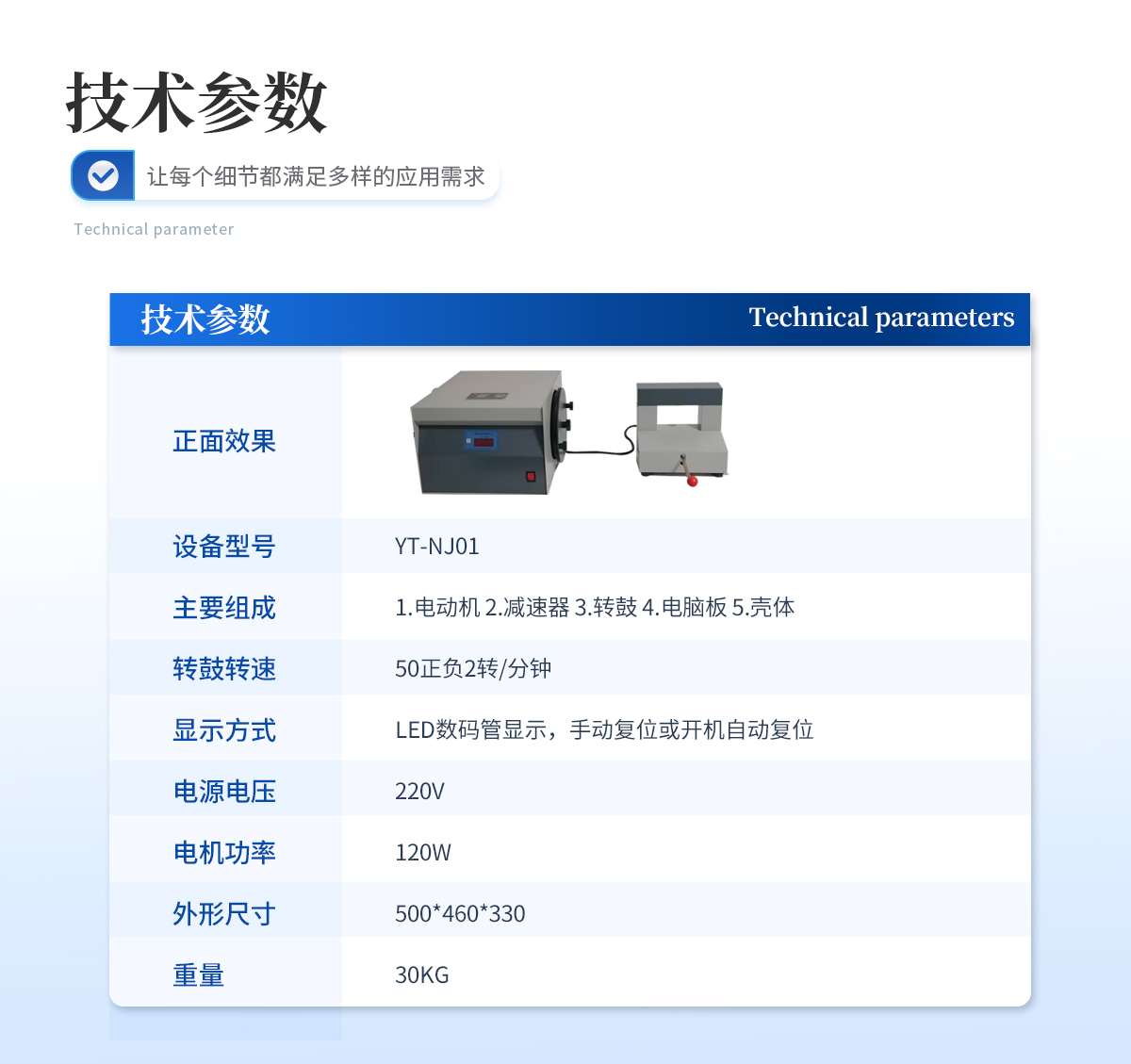 | 1.轉(zhuǎn)鼓轉(zhuǎn)速 50正負(fù)2轉(zhuǎn)/分鐘 | 2.顯示方式 LED數(shù)碼管顯示,手動(dòng)復(fù)位或開機(jī)自動(dòng)復(fù)位 | 3.電源電壓 220V | 4.電機(jī)功率 120W | 5.外形尺寸 500*460*330 | 6.重量 30KG |
