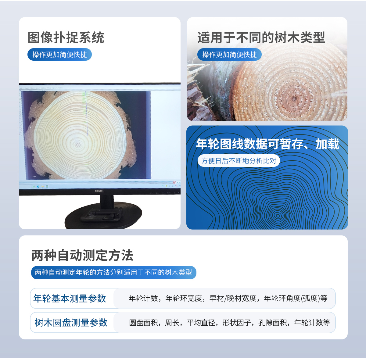1、水平或垂直方向測量年輪、沿直線方向測量年輪(單節(jié))、年輪寬度測量、自動年輪監(jiān)測方式(強度不同)、忽略缺口部分、邊材寬度測量、估算丟失的年輪、以各種方向測量年輪、測量復(fù)雜形狀的樣品年輪(多節(jié))、添加相關(guān)年輪、早材晚材寬度測量、每環(huán)的反射光測量(**值、*小值、平均值、方向)、存儲*后部分年輪、可自定義一些參數(shù)(例如:名字、類型等)、圖像編輯、批量分析。 2、植物年輪測量分析: (1)可自動判讀年輪數(shù)、各年輪平均寬度、早材及晚材寬度、各年輪切向角度和面積、可自動劃分出年輪邊界、早材邊界、晚材邊界,以及識別出很窄的樹輪??山换h除偽年輪、插入斷年輪,亦可分析樹木圓盤面積,周長,平均直徑,形狀因子,孔隙面積,年輪技術(shù)等。 (2)可自動生成國際上通行的分析年表。分析獲得的測量數(shù)據(jù)具備進一步做交叉定年、數(shù)據(jù)分析處理能力。 (3)具有年輪圖線數(shù)據(jù)暫存、加載特性,以便日后不斷地分析比對。 (4)具有精細分析的“軟件體視鏡”特性。有路徑端點吸附定位特性,對不滿意的分析路徑還可斷開、刪除、增加與編輯,以及可將分析結(jié)果圖線保存。 (5)圖線上調(diào)整角度具有跟隨特性,畫路徑的時候可取消或刪除??芍苯臃治鲞_到1GB超高精度掃描的年輪圖像。具有對年輪寬度<0.2mm的極精細年輪的自動分析能力。 (6)可計算樹盤總面積??杀4婊蜃x取TIFF、BMP、PNG、JPEG標準格式的圖像。 3、系統(tǒng)自帶標定功能、XY向可分別標定修正。具有跟隨放大鏡功能,通過鼠標拖動**測量。圖像可放大縮小和局部觀察,可實現(xiàn)鼠標區(qū)域選擇統(tǒng)計。分析圖像、分布圖、結(jié)果數(shù)據(jù)可保存,分析結(jié)果輸出至Excel表,可輸出分析標記圖。