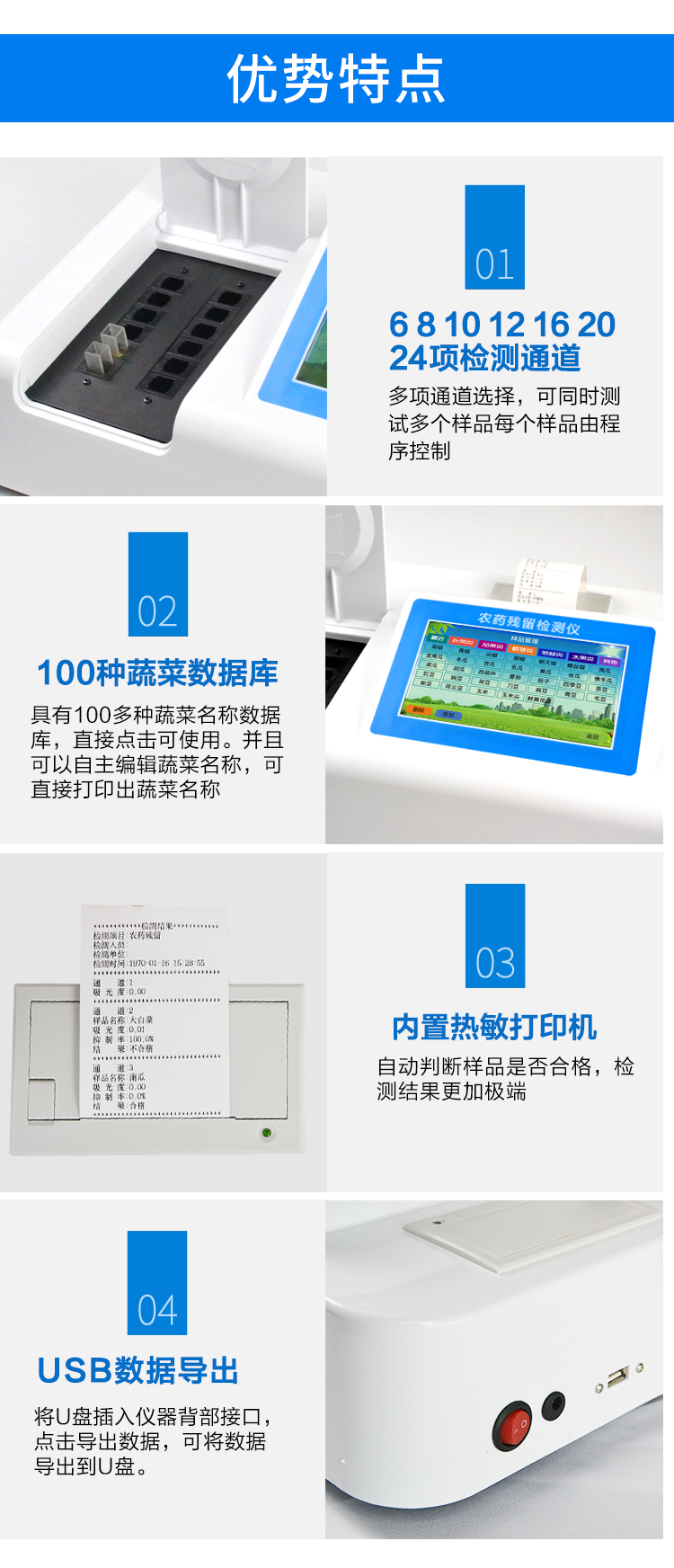 | 乙酰膽堿酯酶和丁酰膽堿酯酶試劑均可以使用,符合國家標(biāo)準(zhǔn)和農(nóng)業(yè)部標(biāo)準(zhǔn)的要求。 | 自動(dòng)判斷樣品是否合格,檢測(cè)結(jié)果更加直觀。 | 儀器具有100多種蔬菜名稱菜單庫,分類管理,并可按需添加或刪除蔬菜名,編輯蔬菜名稱,可直接打印出蔬菜名稱。 | 檢測(cè)通道:10個(gè)檢測(cè)通道,可以同時(shí)測(cè)試多個(gè)樣品,循環(huán)檢測(cè),即放即檢,每個(gè)樣品由程序控制分別獨(dú)立工作,不會(huì)互相干擾。 | 智能操作系統(tǒng),采用更加人性化操作,主控采用多核處理器,主頻1.88Ghz,運(yùn)轉(zhuǎn)速度更快速,穩(wěn)定性更強(qiáng)。 | 顯示方式:7英寸高靈敏真彩觸摸屏顯示,人性化中文操作界面,讀數(shù)直觀、簡(jiǎn)單。 | 打印機(jī)采用串口5v打印,可選擇手動(dòng)打印或者自動(dòng)打印,三分鐘出打印結(jié)果,打印格式為檢測(cè)人姓名、吸光度差值、檢測(cè)時(shí)間、檢測(cè)機(jī)構(gòu)、樣品名稱及結(jié)果判定。 | 光源采用進(jìn)口超高亮發(fā)光二極管,具有低功耗、高精度、穩(wěn)定性強(qiáng)、光源可控可以關(guān)掉不使用的光源,響應(yīng)速度快等優(yōu)點(diǎn)。 | 智能恒流穩(wěn)壓,光強(qiáng)自動(dòng)校準(zhǔn),長(zhǎng)時(shí)間連續(xù)工作光源無溫漂現(xiàn)象。 | 儀器具有GPRS遠(yuǎn)傳功能,可插手機(jī)卡實(shí)現(xiàn)數(shù)據(jù)遠(yuǎn)傳平臺(tái),wifi聯(lián)網(wǎng)功能,可將數(shù)據(jù)快速上傳電腦,進(jìn)行數(shù)據(jù)管理與統(tǒng)計(jì)。 | 采用USB2.0接口設(shè)計(jì),方便數(shù)據(jù)的存貯和移動(dòng),并可隨時(shí)與計(jì)算機(jī)直接相連,并且可用計(jì)算機(jī)控制儀器。實(shí)現(xiàn)數(shù)據(jù)查詢、瀏覽、分析、統(tǒng)計(jì)、打印等。 | 智能化程度高,儀器具有自檢功能:具有開機(jī)自檢和調(diào)零功能,具有自動(dòng)檢測(cè)重復(fù)性功能 | 儀器具有自身保護(hù)功能,可設(shè)置用戶名及密碼,防止非工作人員操作等。 | 采用DC12v直流供電,安全系統(tǒng)更高,并且配備6A鋰電池充電器。 | 儀器具有重新校準(zhǔn)、鎖定、恢復(fù)出廠設(shè)置功能。 |