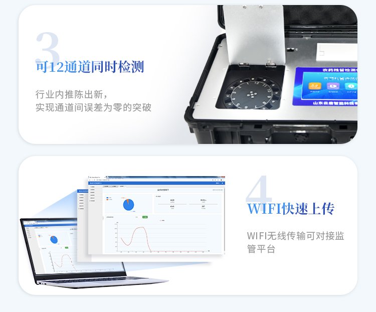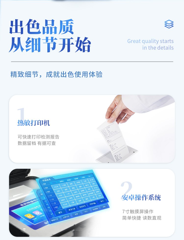 | 安卓智能操作系統(tǒng),采用更加**和人性化操作,儀器具有無線聯(lián)網(wǎng)上傳功能,快速上傳數(shù)據(jù),進(jìn)行數(shù)據(jù)統(tǒng)計(jì)和分析。 | 智能化程度高,儀器具有自檢功能:具有開機(jī)自檢和調(diào)零功能,具有自動檢測重復(fù)性功能;同時(shí),檢測完成可自動打印檢測報(bào)告和二維碼。手機(jī)掃碼可顯示出詳細(xì)檢測信息。 | 儀器帶有監(jiān)管平臺,數(shù)據(jù)可局域網(wǎng)和互聯(lián)網(wǎng)數(shù)據(jù)上傳,檢測結(jié)果直接傳至食品安全監(jiān)管平臺。進(jìn)行區(qū)域食品安全監(jiān)管及大數(shù)據(jù)分析處理與數(shù)據(jù)統(tǒng)計(jì),檢測區(qū)域食品安全長短期動態(tài),達(dá)到食品安全問題預(yù)估、預(yù)警 。 | 樣品處理簡單省力,整體操作快速、安全、便捷。 | 儀器具有自身保護(hù)功能,可設(shè)置用戶名及密碼,防止非工作人員操作等。 | 內(nèi)置強(qiáng)大的數(shù)據(jù)庫,可在儀器上直接選擇樣品名稱、檢測指標(biāo)、送檢單位等信息,也可在儀器上直接編輯錄入樣品名稱、檢測指標(biāo)、送檢單位等信息并保存進(jìn)樣品數(shù)據(jù)庫,方便后期操作調(diào)取使用。 | 儀器具有重新校準(zhǔn)、鎖定、恢復(fù)出廠設(shè)置功能。 |