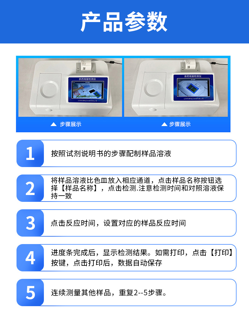 | 乙酰膽堿酯酶和丁酰膽堿酯酶試劑均可以使用,符合國家標(biāo)準(zhǔn)和農(nóng)業(yè)部標(biāo)準(zhǔn)的要求。 | 自動判斷樣品是否合格,檢測結(jié)果更加直觀。 | 儀器具有100多種蔬菜名稱菜單庫,分類管理,并可按需添加或刪除蔬菜名,編輯蔬菜名稱,可直接打印出蔬菜名稱。 | 檢測通道:12個檢測通道,可以同時測試多個樣品,循環(huán)檢測,即放即檢,每個樣品由程序控制分別獨(dú)立工作,不會互相干擾。 | 智能操作系統(tǒng),采用更加人性化操作,主控采用多核處理器,主頻1.88Ghz,運(yùn)轉(zhuǎn)速度更快速,穩(wěn)定性更強(qiáng)。 | 顯示方式:7英寸高靈敏真彩觸摸屏顯示,人性化中文操作界面,讀數(shù)直觀、簡單。 | 打印機(jī)采用串口5v打印,可選擇手動打印或者自動打印,三分鐘出打印結(jié)果,打印格式為檢測人姓名、吸光度差值、檢測時間、檢測機(jī)構(gòu)、樣品名稱及結(jié)果判定。 | 光源采用進(jìn)口超高亮發(fā)光二極管,具有低功耗、高精度、穩(wěn)定性強(qiáng)、光源可控可以關(guān)掉不使用的光源,響應(yīng)速度快等優(yōu)點(diǎn)。 | 智能恒流穩(wěn)壓,光強(qiáng)自動校準(zhǔn),長時間連續(xù)工作光源無溫漂現(xiàn)象。 | 儀器具有GPRS遠(yuǎn)傳功能,可插手機(jī)卡實(shí)現(xiàn)數(shù)據(jù)遠(yuǎn)傳平臺,wifi聯(lián)網(wǎng)功能,可將數(shù)據(jù)快速上傳電腦,進(jìn)行數(shù)據(jù)管理與統(tǒng)計。 | 采用USB2.0接口設(shè)計,方便數(shù)據(jù)的存貯和移動,并可隨時與計算機(jī)直接相連,并且可用計算機(jī)控制儀器。實(shí)現(xiàn)數(shù)據(jù)查詢、瀏覽、分析、統(tǒng)計、打印等。 | 智能化程度高,儀器具有自檢功能:具有開機(jī)自檢和調(diào)零功能,具有自動檢測重復(fù)性功能 | 儀器具有自身保護(hù)功能,可設(shè)置用戶名及密碼,防止非工作人員操作等。 | 采用DC12v直流供電,安全系統(tǒng)更高,并且配備6A鋰電池充電器。 | 儀器具有重新校準(zhǔn)、鎖定、恢復(fù)出廠設(shè)置功能。 |