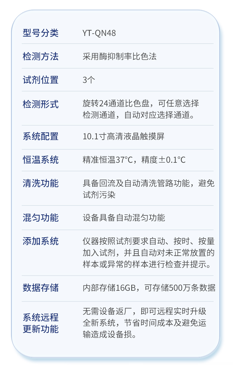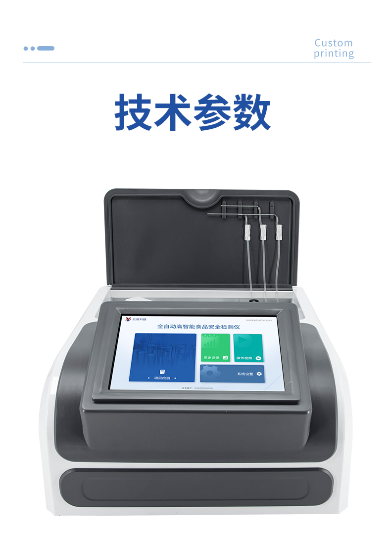 | 1. 試劑位置:3個 | 2. 檢測形式:旋轉(zhuǎn)48通道比色盤,可任意選擇檢測通道,自動對應(yīng)選擇通道。 | 3. 系統(tǒng)配置:10.1寸高清液晶觸摸屏,采用ARM Cortex-A7,RK3288/4核處理器,運行內(nèi)存1GB。Android7.1.1 系統(tǒng)分辨率1280×800。 | 4.恒溫系統(tǒng):具有自動加溫溫控系統(tǒng),精準恒溫37℃,精度±0.1℃。 | 5.添加系統(tǒng):儀器按照試劑要求自動、按時、按量加入試劑,并且自動對未正常放置的樣本或異常的樣本進行檢查并提示。 | 6.清洗功能:儀器具備回流及自動清洗管路功能,避免試劑污染。 | 7.混勻功能:設(shè)備具備自動混勻功能。 | 8.光源校準:設(shè)備可自動校準,確保檢測準確度。 | 9.實時監(jiān)控:儀器測試過程中屏幕顯示運行狀態(tài),可實時查看。 | 10.數(shù)據(jù)存儲:內(nèi)部存儲16GB,可存儲500萬條數(shù)據(jù)。 | 11.樣品多選功能:設(shè)備具備樣品一鍵多選功能,選擇樣品自動匹配檢測通道。 | 12.項目預(yù)設(shè):可提前設(shè)置單個及多個相同或不相同的檢測任務(wù),可單次或者多次調(diào)取,減少檢測時間。 | 13.自定義打印系統(tǒng):內(nèi)置自定義打印系統(tǒng),可按需靈活設(shè)置開啟或關(guān)閉:產(chǎn)品合格證(國家農(nóng)業(yè)部標準),二維碼,抽樣信息、檢測信息,受檢信息等信息的打印。 | 14.A4版本報告打印功能:設(shè)備可自動生成A4版報告,A4報告帶二維碼,可掃描二維碼生成電子版,并可識別真?zhèn)巍?/td> | 15.傳輸方式:儀器配備無線通信模塊: 4G(APN)通訊模塊、Wifi模塊,藍牙傳輸模塊,同時具有USB接口以及RJ45接口能以多種方式實現(xiàn)數(shù)據(jù)保存和數(shù)據(jù)傳輸功能,設(shè)備數(shù)據(jù)可以同步上傳至平臺。 | 16.數(shù)據(jù)監(jiān)管系統(tǒng):設(shè)備自帶監(jiān)管平臺,并可同步對接監(jiān)管平臺,數(shù)據(jù)可局域網(wǎng)和互聯(lián)網(wǎng)數(shù)據(jù)上傳,檢測結(jié)果可直接傳至食品安全監(jiān)管平臺。達到食品安全問題預(yù)估、預(yù)警。 | 17.系統(tǒng)遠程更新功能:無需設(shè)備返廠,即可遠程實時升級全新系統(tǒng),節(jié)省時間成本及避免運輸造成設(shè)備損。 |