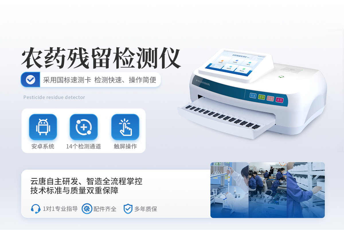 該儀器為云唐科技新研發(fā)一款農(nóng)殘快速檢測儀,采用國標(biāo)速測卡,使檢測速度更快,操作更加簡便。檢測標(biāo)準(zhǔn):依據(jù)國家標(biāo)準(zhǔn)方法(GB/T5009.199-2003)以及世界衛(wèi)生組織WHO、世界糧農(nóng)組織FAO殘留農(nóng)藥檢測標(biāo)準(zhǔn)、世界環(huán)境保護(hù)局EPA參照攝入量等要求來設(shè)計。