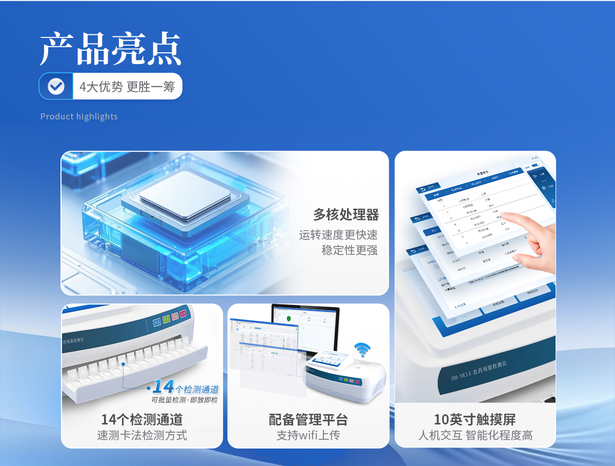 1、★采用速測卡法,省卻冗雜的步驟,提高檢測體驗和效率 2、安卓智能系統(tǒng)7.1版本,操作更加流暢,使用更方便。 3、★10英寸高靈敏真彩觸摸屏顯示,交互性用戶體驗更好。 4、★具有14個檢測卡通道,可更多的批量測試樣品,即放即檢,檢測效率更高。 5、支持wifi、藍(lán)牙傳輸,數(shù)據(jù)可無線上傳;支持U盤拷貝數(shù)據(jù),免驅(qū)動插拔。 6、配置食品安全管理平臺,檢測結(jié)果可長期存儲,進(jìn)行長短期查看分析,輔助管理。 7、儀器具有分類管理蔬菜名稱菜單庫,并可按需編輯蔬菜名稱、檢測單位等信息。 8、內(nèi)置熱敏打印機(jī),可選擇性打印詳細(xì)的檢測信息。 9、★檢測過程中檢測倉自動彈出,自動關(guān)閉。 10、主控采用多核處理器,主頻1.88Ghz,運轉(zhuǎn)速度更快速,穩(wěn)定性更強(qiáng)。