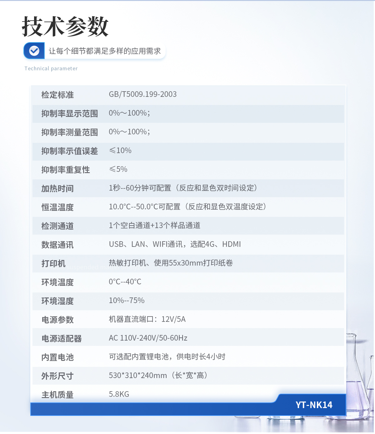 檢定標(biāo)準(zhǔn):GB/T5009.199-2003 抑制率顯示范圍:0%~100%; 抑制率測量范圍:0%~100%; 抑制率示值誤差:≤10% 抑制率重復(fù)性:≤5% 加熱時間:1秒--60分鐘可配置(反應(yīng)和顯色雙時間設(shè)定) 恒溫溫度:10.0℃--50.0℃可配置(反應(yīng)和顯色雙溫度設(shè)定) 檢測通道:1個空白通道+13個樣品通道 數(shù)據(jù)通訊:USB、LAN、WIFI通訊,選配4G、HDMI 打印機(jī):熱敏打印機(jī)、使用55x30mm打印紙卷 環(huán)境溫度:0℃--40℃ 環(huán)境濕度:10%--75% 電源參數(shù):機(jī)器直流端口:12V/5A 電源適配器:AC 110V-240V/50-60Hz 內(nèi)置電池:可選配內(nèi)置鋰電池,供電時長4小時 外形尺寸:530*310*240mm(長*寬*高) 主機(jī)質(zhì)量:5.8KG