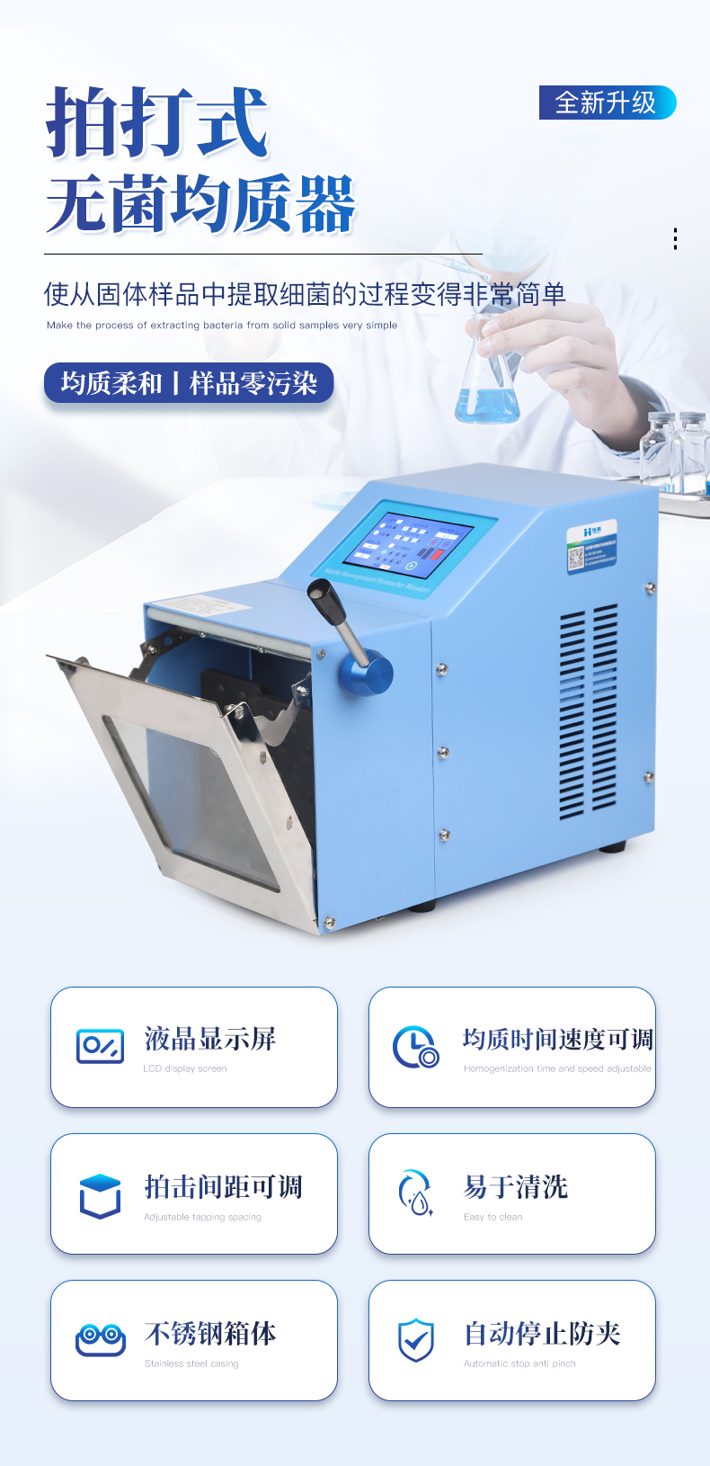 ●5英寸液晶顯示屏。 ●可儲存三組工作程序。 ●可調(diào)整的均質(zhì)時間。 ●均質(zhì)速度可調(diào)節(jié)或固定。 ●拍擊器可調(diào)整前后距離。 ●無菌一次性濾袋,保證衛(wèi)生。 ●全開啟式門,易于清洗。 ●玻璃透明窗口易于觀察 。 ●樣品與均質(zhì)儀無接觸,如無樣品泄露則不需進行系統(tǒng)清洗. ●均質(zhì)柔和、樣品零污染、無損傷、不升溫、不需要滅菌處理,不需洗刷器皿。