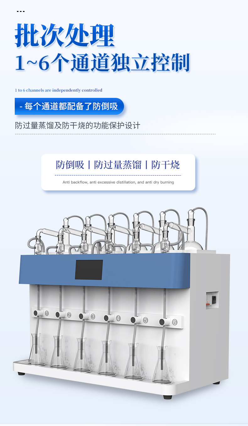 | 1.自動化程度高:內置冷卻水循環(huán)機,實現全自動化操作,提高實驗效率與準確性。 | 2.多通道獨立控制:3個加熱單元各自獨立,配備防倒吸、防過量蒸餾及防干燒保護。 | 3.智能觸控:7寸液晶觸摸屏,支持自定義保存*多1000種蒸餾方法,內置18種國標方法。 | 4.精準控制:采用**陶瓷遠紅外加熱,具備時間與重量雙重終點控制,確保蒸餾精度達0.1ml。 | 5.安全可靠:集成自動清洗、自動氣密檢查、反吹等功能,確保設備長期穩(wěn)定運行。 | 6.操作簡便:一鍵啟動,支持遠程OTA系統(tǒng)升級,滿足不同用戶的使用需求。 |