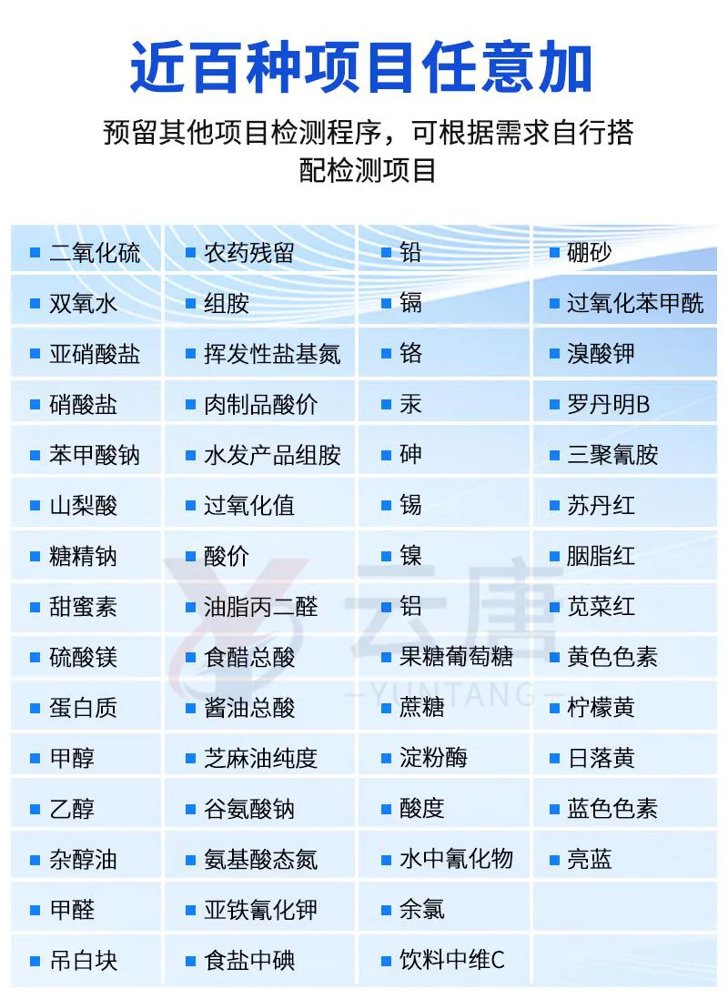 可快速檢測各類食品中的甲醛、二氧化硫、亞硝酸鹽的含量,儀器預(yù)留其他項目檢測程序和端口,根據(jù)日后需求可方便的自主增加檢測項目。