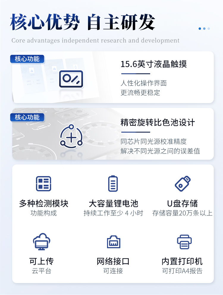 | 1. 功能構(gòu)成:主要包括分光光度模塊、新型農(nóng)殘檢測(cè)模塊、膠體金檢測(cè)模塊、熒光檢測(cè)模塊、數(shù)字化管理模塊等,所有模塊集成一體,可快速檢測(cè)200多種食品安全項(xiàng)目,如獸藥殘留、農(nóng)藥殘留、非法添加劑、細(xì)菌數(shù)值等指標(biāo)。 | 2. 檢測(cè)樣品種類:餐具及廚房用品、瓜果蔬菜及其制品、水產(chǎn)品及其制品、畜禽產(chǎn)品及其制品、嬰幼兒乳品及奶粉制品、蜂蜜、糧油及其制品、調(diào)味品(食醋、醬油、味精、鹽等)、酒類茶葉及其制品、食用菌、飲料、蛋類藥物殘留(雞蛋,鴨蛋等)、米豆面制品、糖果糕點(diǎn)類(小食品)、薯類及膨化食品、瓶(桶)裝飲用水、添加食用色素的食品、使用添加劑的食品、含有有毒有害物質(zhì)的相關(guān)食品。 | 3、顯示屏幕:儀器采用15.6英寸液晶觸摸屏顯,搭配運(yùn)行安卓智能操作系統(tǒng),主控芯片采用ARM Cortex-A7,RK3288/4核處理器,主頻1.88Ghz,操作方便,性能更強(qiáng)。 | 4、供電模式:儀器交直流兩用,直流12V供電,可連接車載電源,配18ah大容量充電鋰電池,電量可實(shí)時(shí)顯示,無外部電源條件下可持續(xù)工作至少 4 小時(shí)。 | 5、檢測(cè)通道:≥24通道;采用精密旋轉(zhuǎn)比色池設(shè)計(jì),使用同芯片同光源校準(zhǔn)精度,解決不同光源之間的誤差值,更加準(zhǔn)確**,采用高精度進(jìn)口四波長冷光源,每個(gè)通道均配置 410、520、590、630nm 波長光源,標(biāo)配**的光路切換裝置,專利光路切換功能可實(shí)現(xiàn)64波長,并且所有檢測(cè)項(xiàng)目可實(shí)現(xiàn)所有通道同時(shí)檢測(cè). | 6、通訊接口:配備無線通信模塊、4G(APN)通訊模塊、藍(lán)牙傳輸,同時(shí)具有雙USB接口以及RJ45網(wǎng)線接口,可以多方式實(shí)現(xiàn)數(shù)據(jù)保存及數(shù)據(jù)傳輸。 | 7、存儲(chǔ)方式:支持U盤存儲(chǔ),兩個(gè)標(biāo)準(zhǔn)USB接口,免驅(qū)動(dòng)安裝。檢測(cè)結(jié)果存儲(chǔ)容量20萬條以上,可生成Excel表格進(jìn)行拷貝,并具有登錄保護(hù)功能。 | 8、操作系統(tǒng):儀器可在同一檢測(cè)界面自動(dòng)對(duì)應(yīng)相關(guān)檢測(cè)通道,一次性選擇不少于11個(gè)樣品名稱,無需退出界面,節(jié)省操作時(shí)間。并可以對(duì)每個(gè)通道屬性和樣品信息單獨(dú)進(jìn)行編輯,例如送檢單位、人員,檢測(cè)人員等,打印時(shí)勾選打印顯示。 | 9、數(shù)據(jù)集成系統(tǒng):設(shè)備首頁自動(dòng)匯總分析檢測(cè)數(shù)據(jù),包含:周檢測(cè)數(shù)據(jù)、月檢測(cè)數(shù)據(jù),全部檢測(cè)總數(shù)量,包含檢測(cè)總數(shù),合格數(shù),不合格數(shù),以及相關(guān)柱形分析圖,各項(xiàng)檢測(cè)數(shù)據(jù)一目了然,無需電腦查詢,更加快捷直觀。 | 10、數(shù)據(jù)庫系統(tǒng):十幾項(xiàng)數(shù)據(jù)庫分類管理儀器:包含項(xiàng)目類型、項(xiàng)目數(shù)據(jù)、檢測(cè)數(shù)據(jù)、歷史記錄、國標(biāo)信息、曲線信息、采樣信息、檢測(cè)信息、受檢信息、復(fù)核信息、圖表信息、光源校準(zhǔn)信息、打印樣式信息、樣品庫信息等等,數(shù)據(jù)庫之間互相協(xié)調(diào)聯(lián)動(dòng)保證數(shù)據(jù)的真實(shí)完整性。同時(shí)產(chǎn)品數(shù)據(jù)庫以及歷史檢測(cè)記錄支持一鍵檢索功能。 | 11、限量規(guī)判系統(tǒng):具有限量查詢、添加物質(zhì)合規(guī)判定系統(tǒng)。檢測(cè)出結(jié)果后,系統(tǒng)自動(dòng)調(diào)用系統(tǒng)數(shù)據(jù)庫中相關(guān)國標(biāo)進(jìn)行比對(duì)判定,客觀顯示判定結(jié)果是否合格。 | 12、項(xiàng)目預(yù)設(shè)系統(tǒng):儀器具有任務(wù)預(yù)設(shè)模塊,一鍵提前預(yù)設(shè),給出方便快捷的新檢測(cè)方案,每一個(gè)任務(wù)分別可以設(shè)置不同的樣品、批次、編號(hào)、來源、備注、抽樣信息、檢測(cè)信息、受檢信息、復(fù)核信息等更多信息。樣品送檢時(shí)一鍵調(diào)取保存信息,并可多次調(diào)取,適用于大批量檢測(cè)業(yè)務(wù),可以大大提高檢測(cè)效率。 | 13、數(shù)據(jù)監(jiān)管系統(tǒng):同步對(duì)接監(jiān)管平臺(tái),數(shù)據(jù)可局域網(wǎng)和互聯(lián)網(wǎng)數(shù)據(jù)上傳,檢測(cè)結(jié)果可直接傳至食品安全監(jiān)管平臺(tái)。進(jìn)行區(qū)域食品安全監(jiān)管及大數(shù)據(jù)分析處理與數(shù)據(jù)統(tǒng)計(jì),監(jiān)測(cè)區(qū)域食品安全長短期動(dòng)態(tài)及問題預(yù)估、預(yù)警。 | 14.1、全新打印系統(tǒng):內(nèi)置全新打印機(jī),新創(chuàng)自定義打印方式,可按需靈活勾選控制:產(chǎn)品合格證(國家農(nóng)業(yè)部標(biāo)準(zhǔn)要求),二維碼,抽樣信息、檢測(cè)信息,受檢信息、復(fù)核信息、抽樣日期、檢測(cè)日期等信息的打印。 | 14.2、A4紙版本報(bào)告打印功能:設(shè)備擁有兩種結(jié)果展示方式,可以自動(dòng)生成A4打印模板和小票打印模板兩種樣式,可通過WiFi及網(wǎng)線等方式連接外置打印機(jī)可進(jìn)行打印。 | 15、膠體金檢測(cè)模塊:采用單通道CMOS成像處理技術(shù)及膠體金免疫層析技術(shù),可讀取膠體金卡數(shù)據(jù),自動(dòng)采集、處理分析,將檢測(cè)結(jié)果顯示,并可根據(jù)參考限值自動(dòng)判斷檢測(cè)結(jié)果,可檢