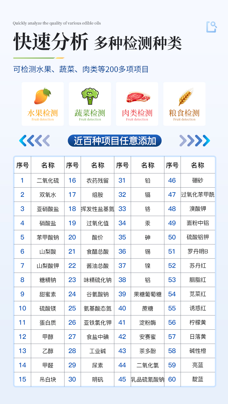 高精度食品安全檢測(cè)儀可快速檢測(cè)60多項(xiàng)目,包含:濫用食品添加劑、非食用化學(xué)物質(zhì)、農(nóng)藥殘留、重金屬含量、病害肉成分、營(yíng)養(yǎng)強(qiáng)化劑、化學(xué)類殘留、食用油脂檢測(cè)、水酒飲品分析、調(diào)味品成分、食用色素等現(xiàn)場(chǎng)的定性定量檢測(cè)。
