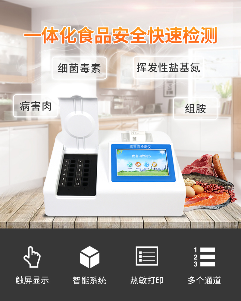 可快速檢測(cè)病害肉、組胺、揮發(fā)性鹽基氮,儀器預(yù)留其他項(xiàng)目檢測(cè)程序和端口,根據(jù)日后需求可方便的自主增加檢測(cè)項(xiàng)目。