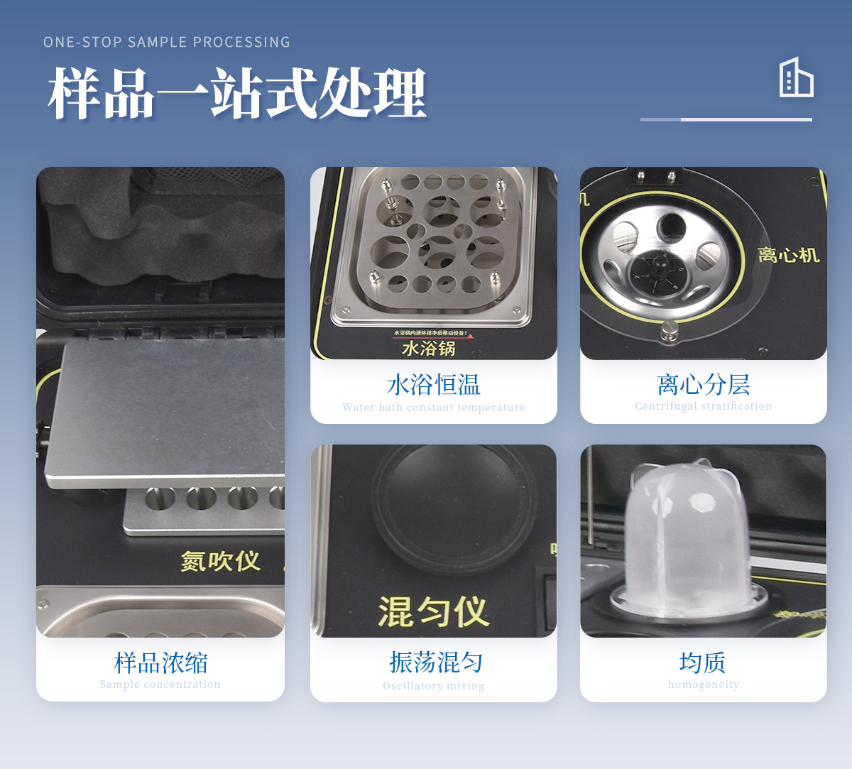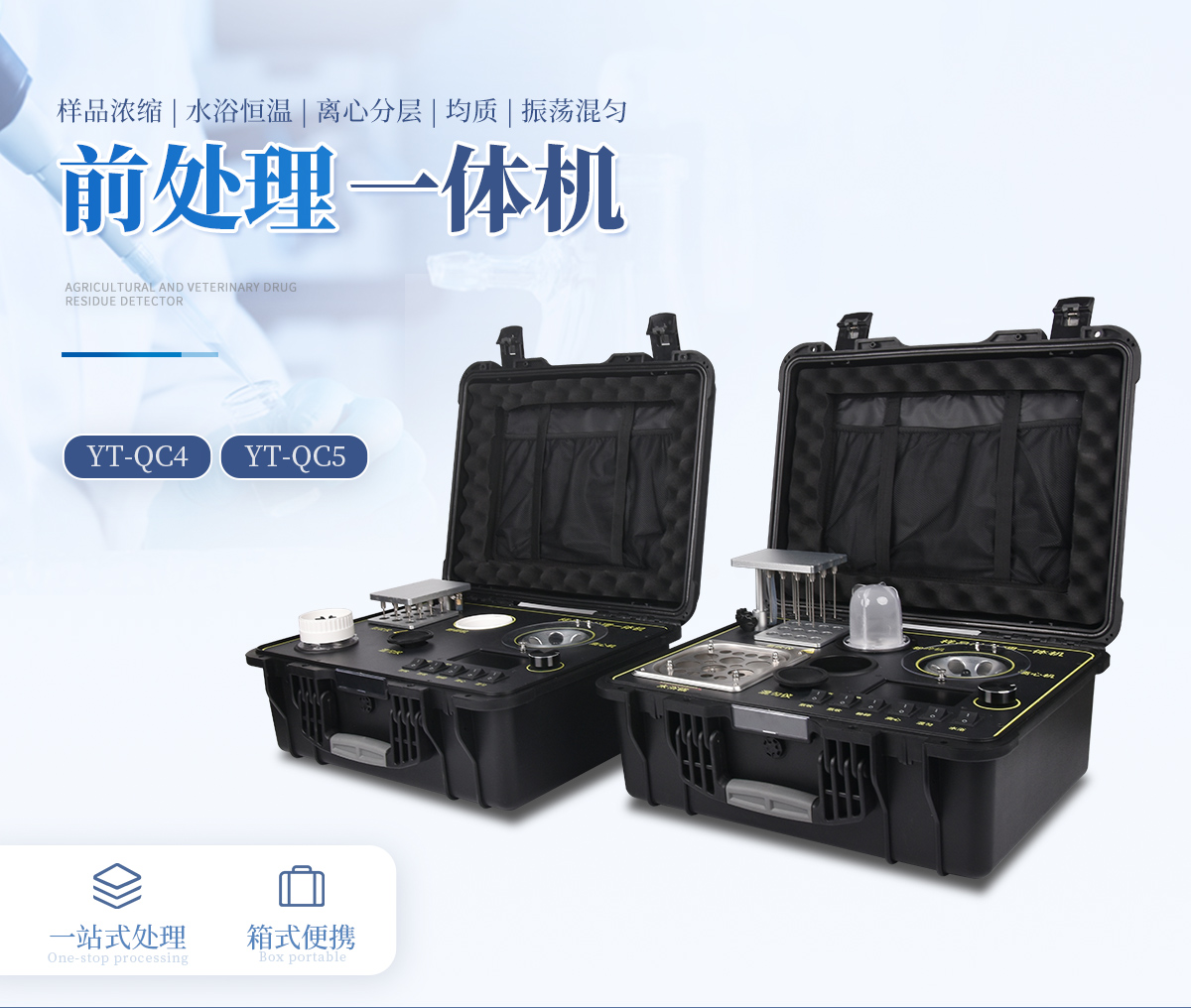 應(yīng)國內(nèi)用戶的實際需求,自行研制開發(fā)的新型儀器——QC05型樣品前處理一體機(jī)。樣品前處理集成箱將樣本前處理過程中樣品濃縮、水浴恒溫、離心分層、均質(zhì)、振蕩混勻等步驟所需設(shè)備進(jìn)行集成,僅需一臺樣品前處理集成箱設(shè)備即可完成所有樣本前處理過程,并且方便攜帶,不僅適用于現(xiàn)場檢測使用,還可用于色譜、質(zhì)譜等分析樣品的純化和制備。