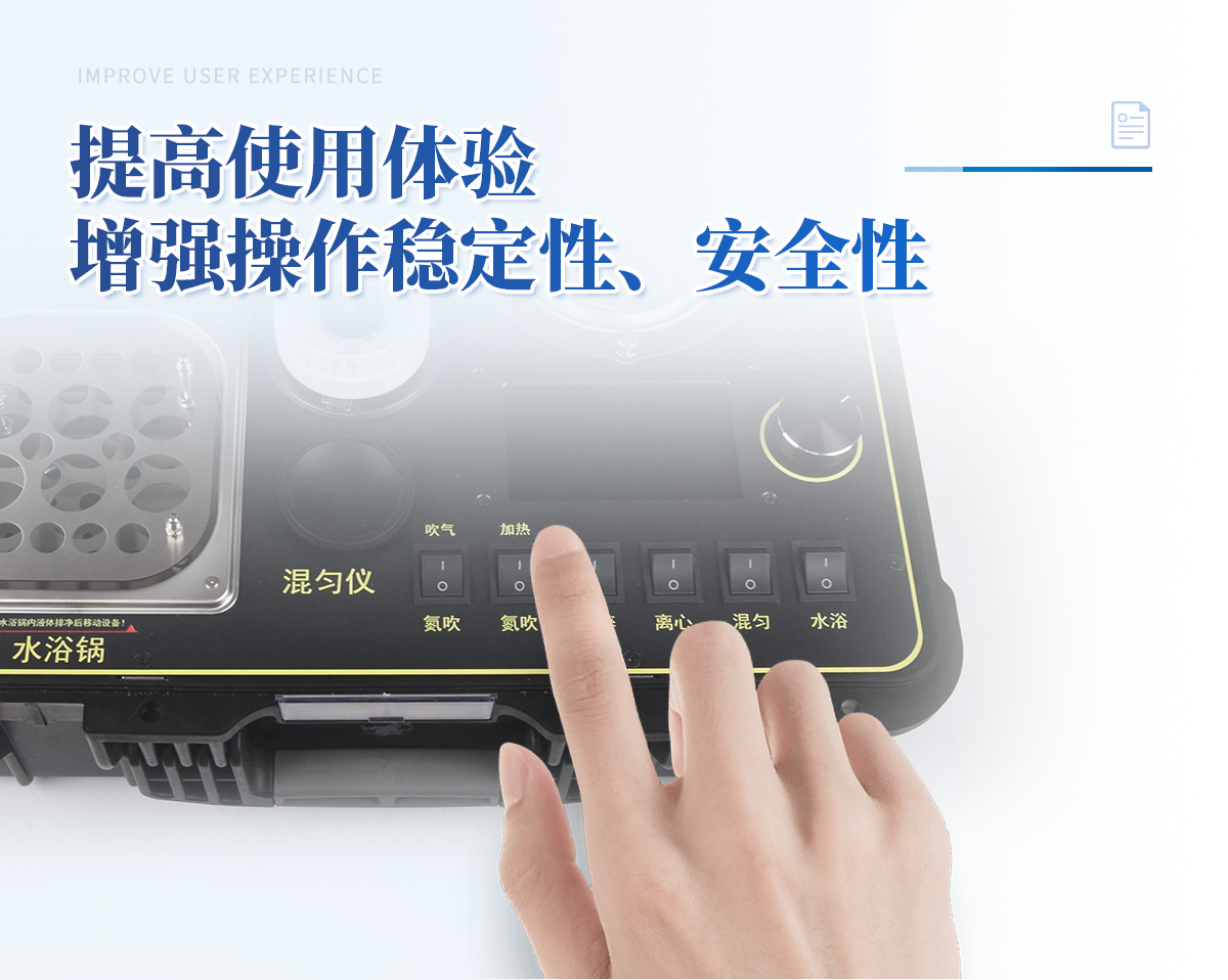 | 1、功能緊湊,集成五種樣品前處理常用的功能,完成樣品一站式處理。 | 2、結(jié)構(gòu)穩(wěn)固,機(jī)箱采用***工程塑料,具備**的抗沖擊性、耐腐蝕性、便攜性。 | 3、操作穩(wěn)定,機(jī)器采用五寸全彩色液晶屏,功能指示性強(qiáng),用戶操作均為實體開關(guān),杜絕佩戴手套和液體噴濺時的操作失效。 |