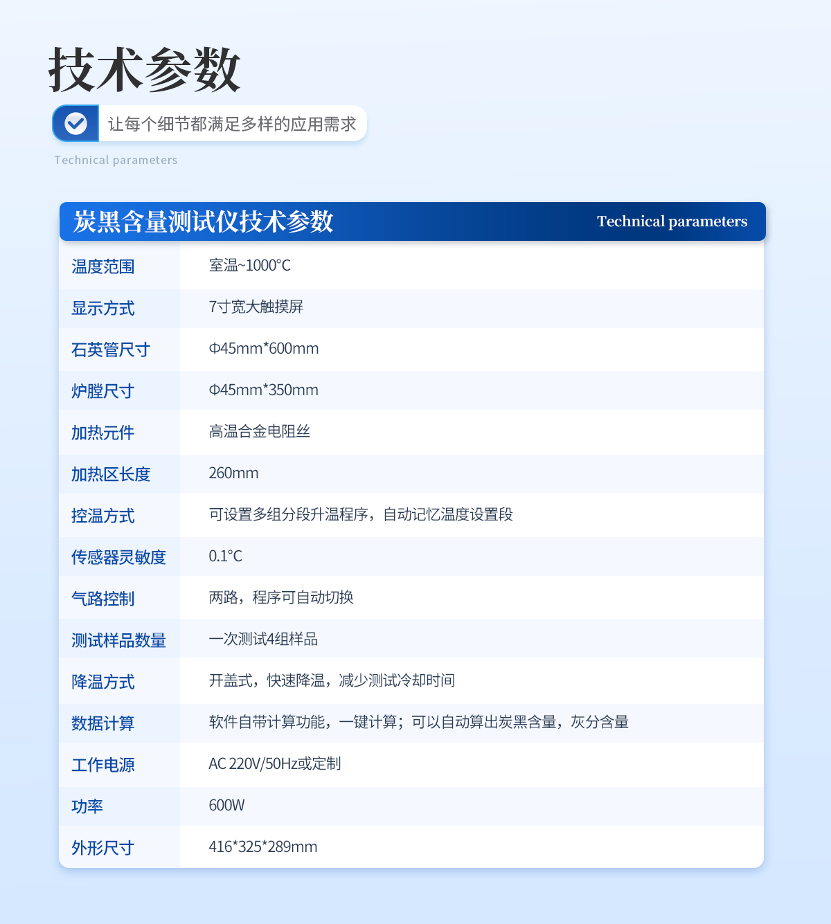 | 1. 采用開蓋式爐體結(jié)構(gòu),方便放置樣品且散熱效果更佳。 | 2. 爐膛采用超長加熱單元,可同時測試4組樣品,大大提高測試效率。 | 3. 軟件自帶計算功能,可以一鍵自動計算出炭黑含量、灰分含量,非常得方便快捷。 | 4. 采用PID精準控溫,控溫精度高,溫度范圍大,爐膛溫度均勻性高。 | 5. 7寸液晶觸摸屏顯示,可一鍵操作啟動,設(shè)定恒溫時間,恒溫精度高; | 6. 智能化可編程控制,可設(shè)置多組分段升溫程序。 |