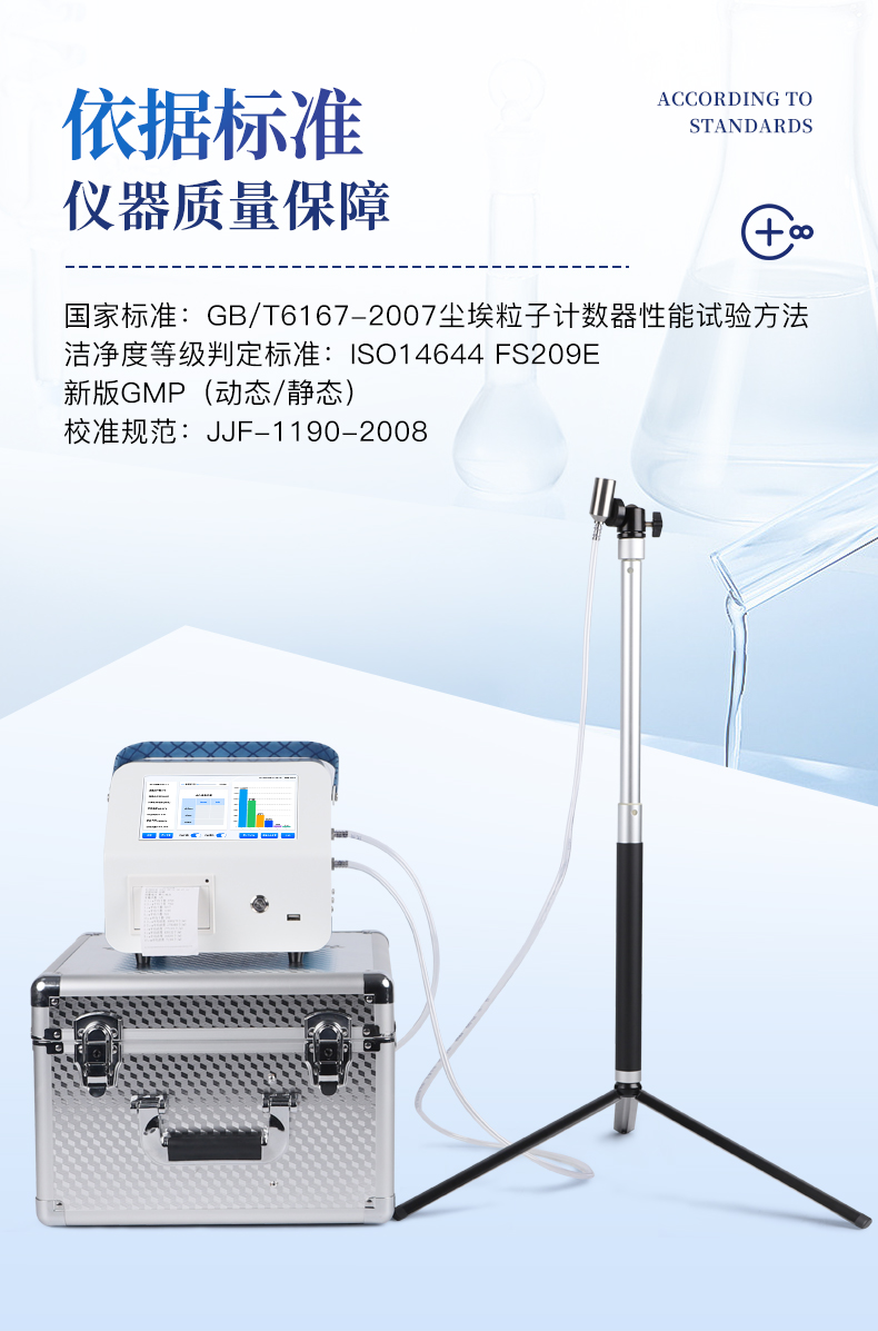 國家標(biāo)準(zhǔn):GB/T6167-2007塵埃粒子計數(shù)器性能試驗(yàn)方法 潔凈度等級判定標(biāo)準(zhǔn):ISO14644 FS209E ,新版GMP(動態(tài)/靜態(tài)) 校準(zhǔn)規(guī)范:JJF-1190-2008