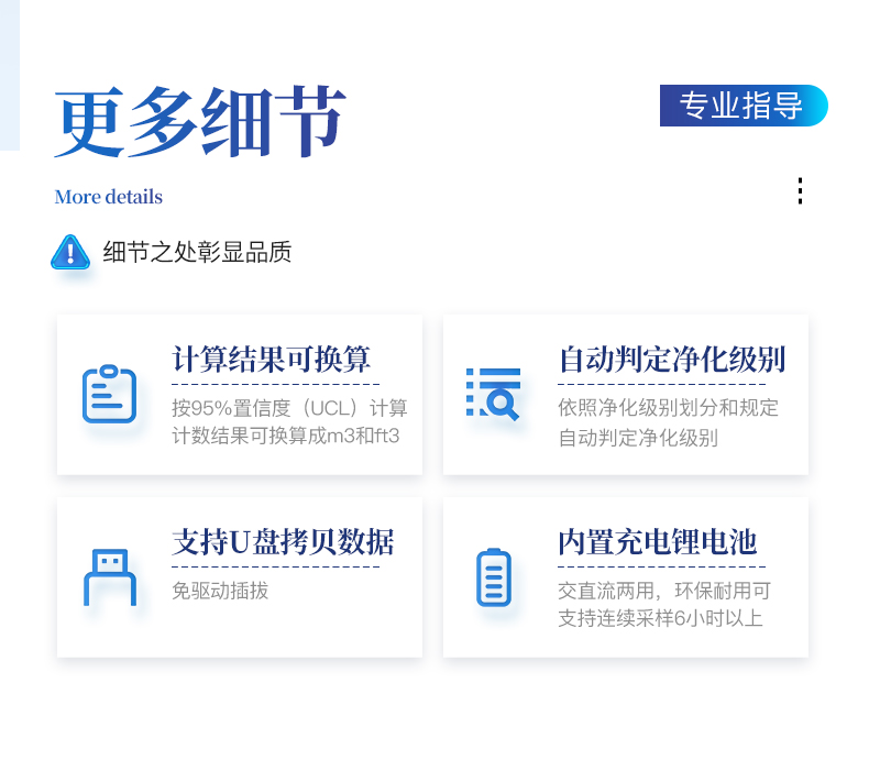 1、安卓系統(tǒng)7.1版本,操作交互體驗(yàn)更好。 2、內(nèi)置溫濕度傳感器、環(huán)境氣壓傳感器 3、核心部件光散射傳感器明顯消除腔體的雜散光,信噪比大為提高。從而使測量更準(zhǔn)確更可靠。 4、按95%置信度(UCL)計算,計數(shù)結(jié)果可換算成m3和ft3 5、依照凈化級別劃分和規(guī)定,自動判定凈化級別,使用便利。 6、帶審計追蹤功能,可查詢、可追溯、可控制,符合FDA 21CFR PART11規(guī)范 7、支持wifi、藍(lán)牙傳輸,數(shù)據(jù)可無線上傳;同時支持U盤拷貝數(shù)據(jù),免驅(qū)動插拔。 8、配置監(jiān)管平臺,檢測結(jié)果可直接無線傳至平臺,進(jìn)行潔凈度長短期分析,輔助管理。 9、內(nèi)置新一代高速熱敏打印機(jī),可選擇所需要打印的粒徑通道,靈活打印結(jié)果。 10、交直流兩用,內(nèi)置充電鋰電池,環(huán)保耐用可支持連續(xù)采樣6小時以上。 11、便捷簡易伸縮式云臺支架,安裝采樣操作更加方便。
