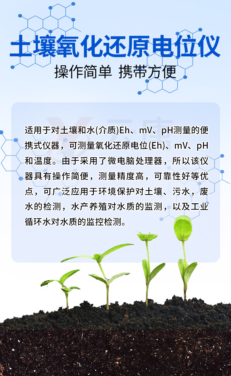 YT-QX6530型智能便攜式氧化還原電位測定儀是一種適用于對土壤和水(介質(zhì))Eh、mV、pH測量的便攜式儀器,可測量氧化還原電位(Eh)、mV、pH和溫度。由于采用了微電腦處理器,所以該儀器具有操作簡便,測量精度高,可靠性好等優(yōu)點,可廣泛應(yīng)用于環(huán)境保護(hù)對土壤、污水,廢水的檢測,水產(chǎn)養(yǎng)殖對水質(zhì)的監(jiān)測,以及工業(yè)循環(huán)水對水質(zhì)的監(jiān)控檢測。