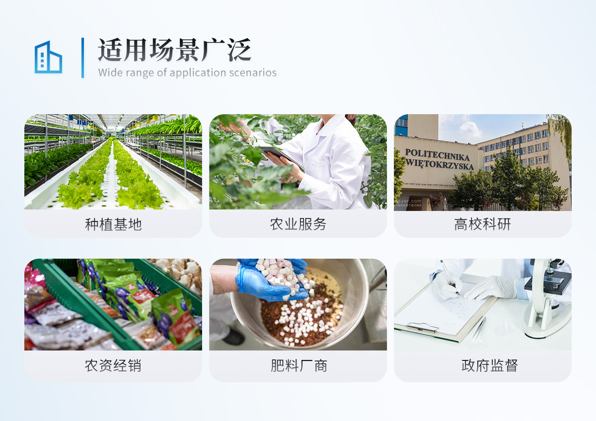 肥料中氮(N)、磷(P)、鉀(K)等養(yǎng)分同時(shí)、快速、準(zhǔn)確檢測(cè)。