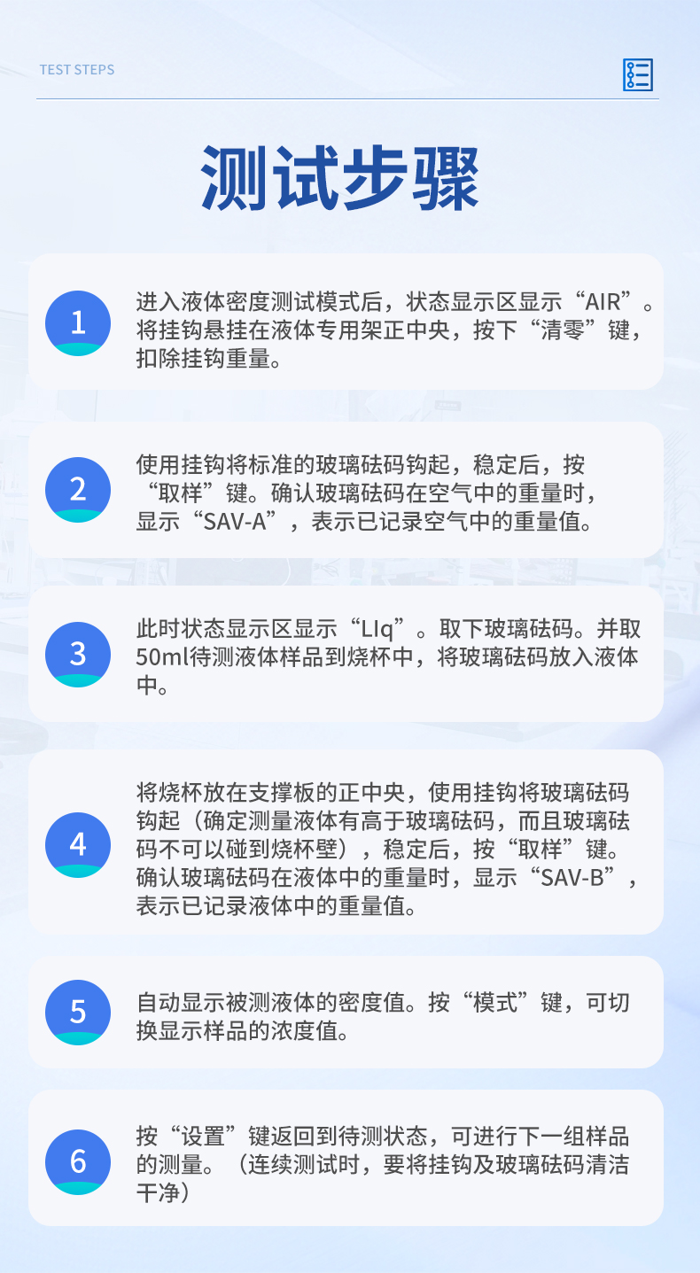 | 1、進(jìn)入液體密度測試模式后,狀態(tài)顯示區(qū)顯示“AIR”。 將掛鉤懸掛在液體專用架正中央,按下“清零”鍵,扣除掛鉤重量。 | 2、使用掛鉤將標(biāo)準(zhǔn)的玻璃砝碼鉤起,穩(wěn)定后,按“取樣”鍵。確認(rèn)玻璃砝碼在空氣中的重量時(shí),顯示“SAV-A”,表示已記錄空氣中的重量值。 | 3、此時(shí)狀態(tài)顯示區(qū)顯示“LIq”。取下玻璃砝碼。并取50ml待測液體樣品到燒杯中,將玻璃砝碼放入液體中。 | 4、將燒杯放在支撐板的正中央,使用掛鉤將玻璃砝碼鉤起(確定測量液體有高于玻璃砝碼,而且玻璃砝碼不可以碰到燒杯壁),穩(wěn)定后,按“取樣”鍵。確認(rèn)玻璃砝碼在液體中的重量時(shí),顯示“SAV-B”,表示已記錄液體中的重量值。 | 5、自動(dòng)顯示被測液體的密度值。按“模式”鍵,可切換顯示樣品的濃度值。 | 7、按“設(shè)置”鍵返回到待測狀態(tài),可進(jìn)行下一組樣品的測量。(連續(xù)測試時(shí),要將掛鉤及玻璃砝碼清潔干凈) | 儀器尺寸:195*220*190mm | 包裝尺寸:430*200*360mm | 包裝重量:4kg |