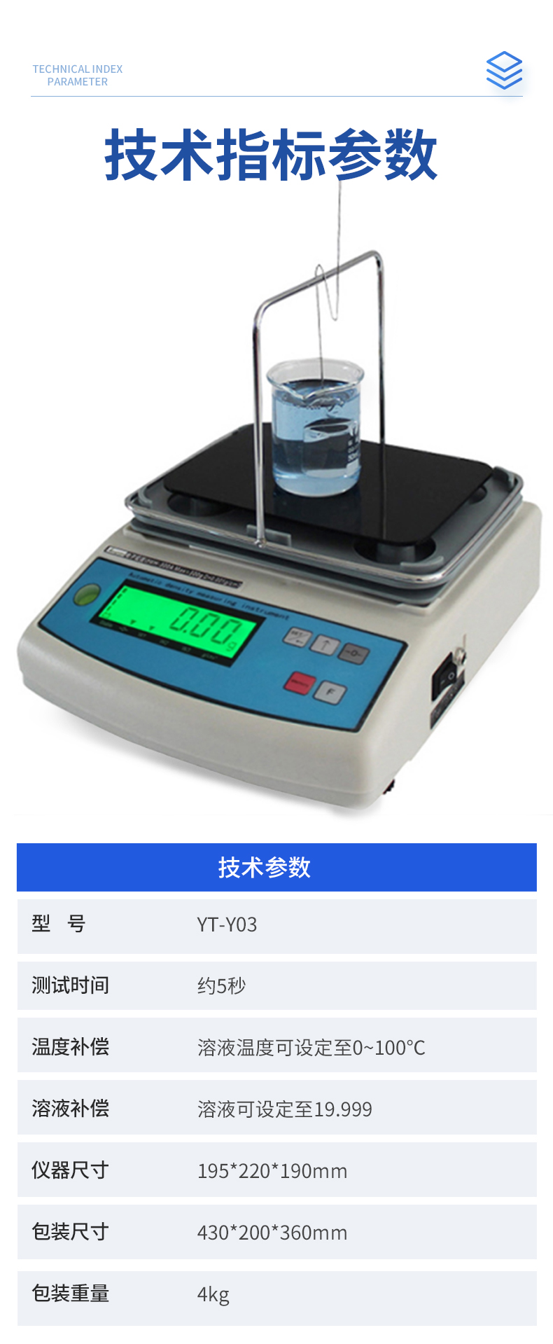 | YT-Y01 稱重范圍:0.01-300g 稱重精度:0.01g 密度精度:0.001g/cm3 | YT-Y02 稱重范圍:0.01-600g 稱重精度:0.01g 密度精度:0.001g/cm3 | YT-Y03 稱重范圍:0.005-300g 稱重精度:0.005g 密度精度:0.0001g/cm3 | 測試種類 化工溶液、化工助劑、現(xiàn)代能源、石油燃燒、藥劑、油漆涂料、瀝青、食用油等各種液體 | 測試時(shí)間 約5秒 | 顯示值 密度、體積 | 溫度補(bǔ)償 溶液溫度可設(shè)定至0~100℃ | 溶液補(bǔ)償 溶液可設(shè)定至19.999 |