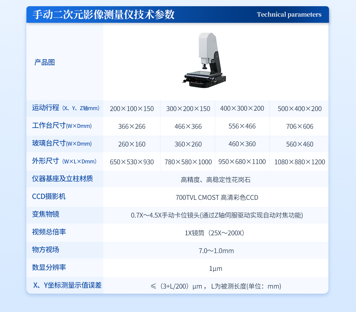 | l 運(yùn)動(dòng)行程(X、Y、Z軸mm):300×200×150 | l 工作臺(tái)呎寸(W×Dmm): 456×366 | l 玻璃臺(tái)呎寸(W×Dmm): 360×260 | l 外形尺寸(W×L×Dmm): 780×580×1000 | l 工作距離:90mm | l 儀器基座材質(zhì):高精度、高穩(wěn)定性花崗石 | l CCD攝影機(jī):700TVL COMST高清彩色CCD | l 變焦物鏡: 0.7X~4.5X手動(dòng)卡位鏡頭 | l 視頻總倍率:1X鏡筒(25X~200X) | l 物方視場(chǎng): 7.0~1.0mm | l 數(shù)顯分辨率:1μm | l X、Y坐標(biāo)測(cè)量示值誤差≤(3+L/200)μm , L為被測(cè)長(zhǎng)度(單位:mm) |
