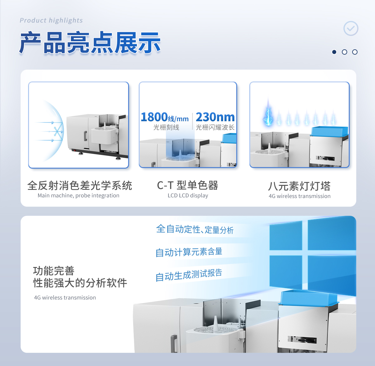 元素燈和氘燈雙重切換和背景扣除,具備氘燈與自吸收兩種背景校正模式,背景信號 1A 時,扣背景能力 50 倍以上。 8、 外觀采用流線型鈑金工藝設計,簡約時尚,美觀大方 9、 功能完善,性能強大的分析軟件。 人性化的操作界面,讓您的操作易如反掌,可切換中英文 Windows 風格軟件界面,可在 Windows XP, Windows 7 等操作系統(tǒng)下完美運行,全自動定性、定量分析,自動計算元素含量,自動生成測試報告。