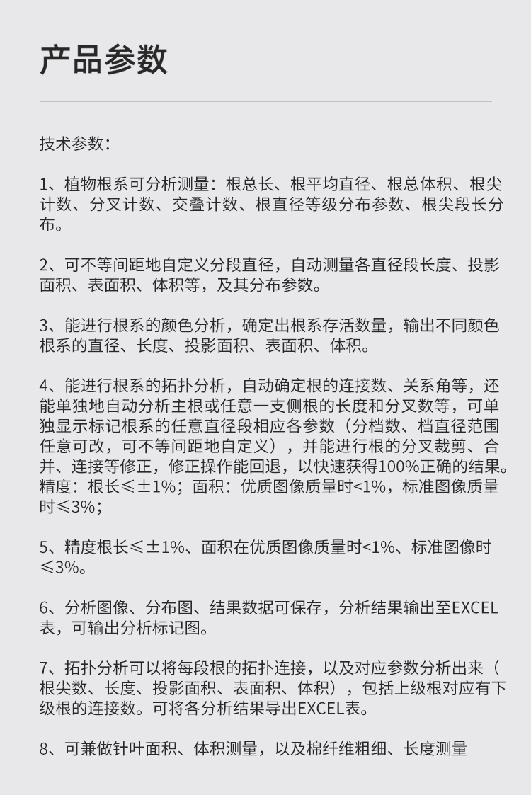 1、 圖像撲捉系統(tǒng):經(jīng)過廠家調(diào)試的標(biāo)準(zhǔn)根系掃描設(shè)備,匹配專門的光源、具有持續(xù)校正特點(diǎn)、根系固定裝置等