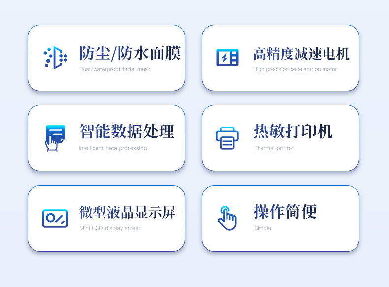 | 防塵、防水面膜、薄膜按鍵和微型液晶顯示屏 | 高精度減速電機(jī)及調(diào)速器組成的振動(dòng)部分 | CPU 智能數(shù)據(jù)處理部分 | 高分辨率熱敏打印機(jī) | 測(cè)量結(jié)果**小數(shù)后4 位 | 儀器結(jié)構(gòu)牢固,外型美觀,操作簡(jiǎn)便 |