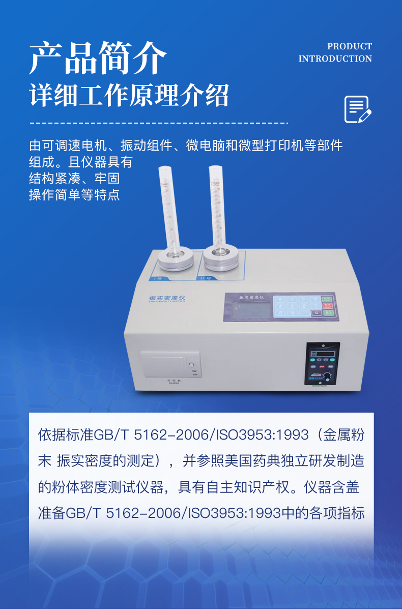 | YT-ZS2型粉體密度測(cè)試儀是由丹東市恒瑞儀器有限公司依據(jù)標(biāo)準(zhǔn)GB/T 5162-2006/ISO3953:1993(金屬粉末 振實(shí)密度的測(cè)定),并參照美國(guó)藥典獨(dú)立研發(fā)制造的粉體密度測(cè)試儀器,具有自主知識(shí)產(chǎn)權(quán)。儀器含蓋準(zhǔn)備GB/T 5162-2006/ISO3953:1993中的各項(xiàng)指標(biāo)。 | YT-ZS2型粉體密度測(cè)試儀由可調(diào)速電機(jī)、振動(dòng)組件、微電腦和微型打印機(jī)等部件組成。且儀器具有結(jié)構(gòu)緊湊、牢固,操作簡(jiǎn)單等特點(diǎn)。 |