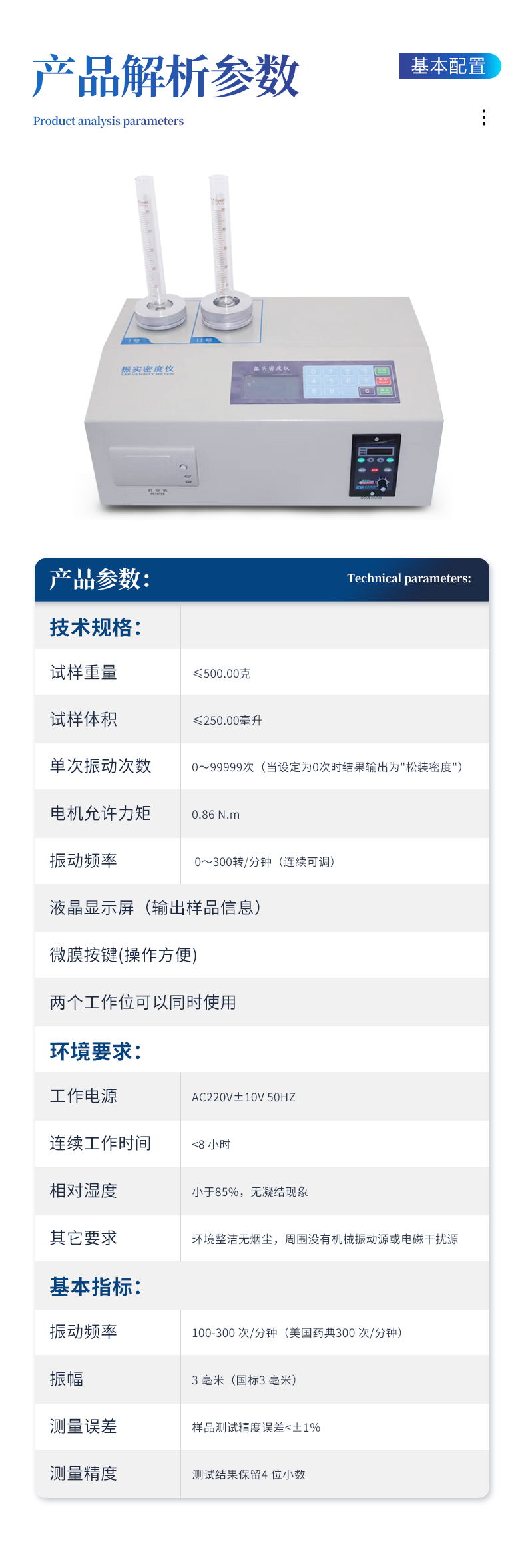| 試樣重量:≤500.00克; | 試樣體積:≤250.00毫升; | 單次振動(dòng)次數(shù):0~99999次(當(dāng)設(shè)定為0次時(shí)結(jié)果輸出為"松裝密度"); | 電機(jī)允許力矩:0.86 N.m; | 振動(dòng)頻率: 0~300轉(zhuǎn)/分鐘(連續(xù)可調(diào)); | 液晶顯示屏(輸出樣品信息); | 微膜按鍵(操作方便) | 兩個(gè)工作位可以同時(shí)使用 | 振動(dòng)幅度:3mm,(可調(diào)) | ZS2高精度振實(shí)密度儀是專(zhuān)門(mén)針對(duì)固體粉體密度的測(cè)量?jī)x器,按照國(guó)家標(biāo)準(zhǔn)GB/T 5162-2006/ISO3953:1993,參照美國(guó)藥典標(biāo)準(zhǔn)研發(fā)制造。廣泛應(yīng)用于工業(yè)、電池材料、藥品材料、奶制品、磨料、造紙、水泥、涂料、科研機(jī)構(gòu)、大中專(zhuān)院校以及各種金屬和非金屬行業(yè)。 |